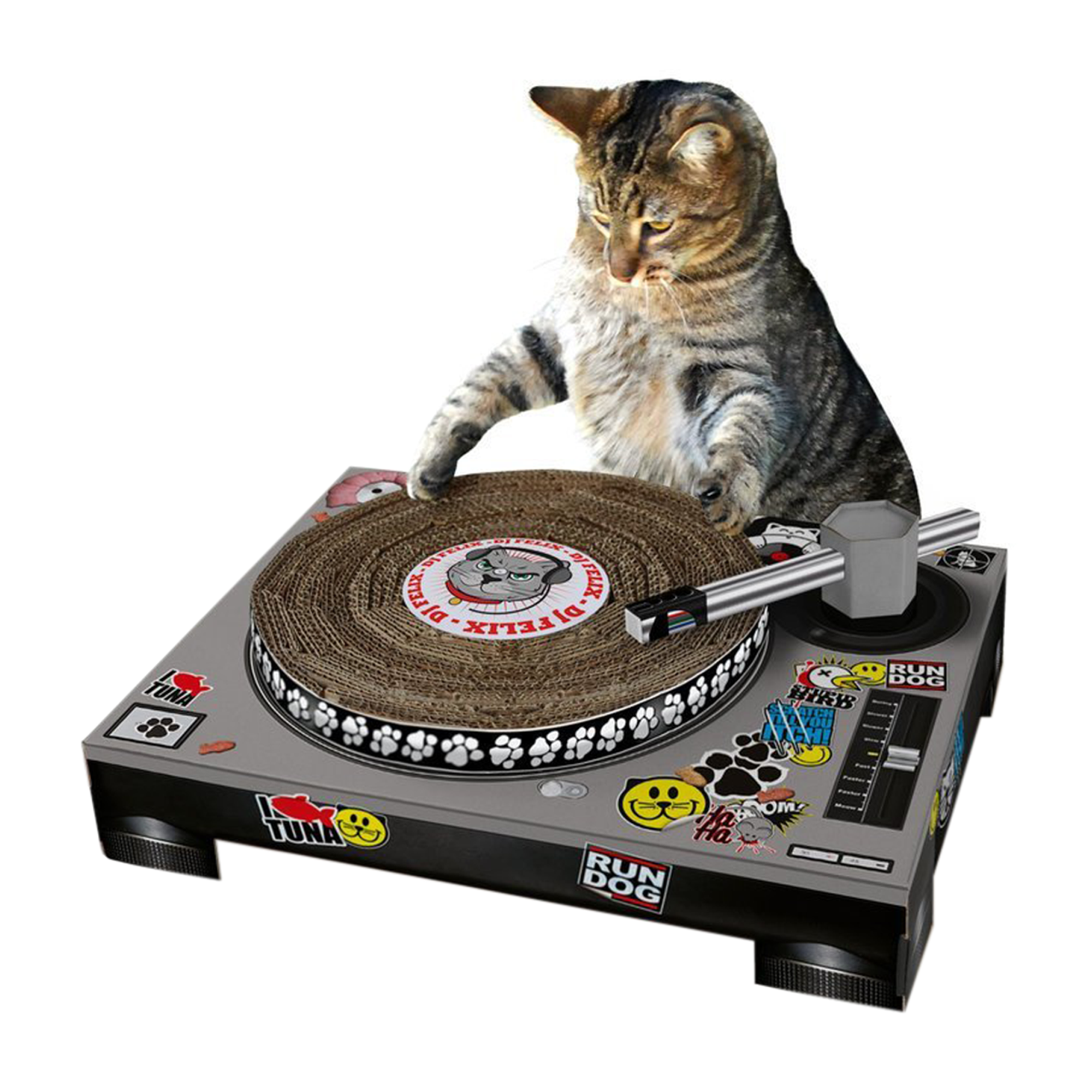 DJ Félix aux platines ! Ce soir, c’est le chat qui met l’ambiance ! Minou est un scratcheur hors pair ! Ce grattoir pour chat en carton a la forme d’une platine de scratching. Très robuste, le carton résistera aux coups de griffes les plus énergiques de votre compagnon à quatre pattes.