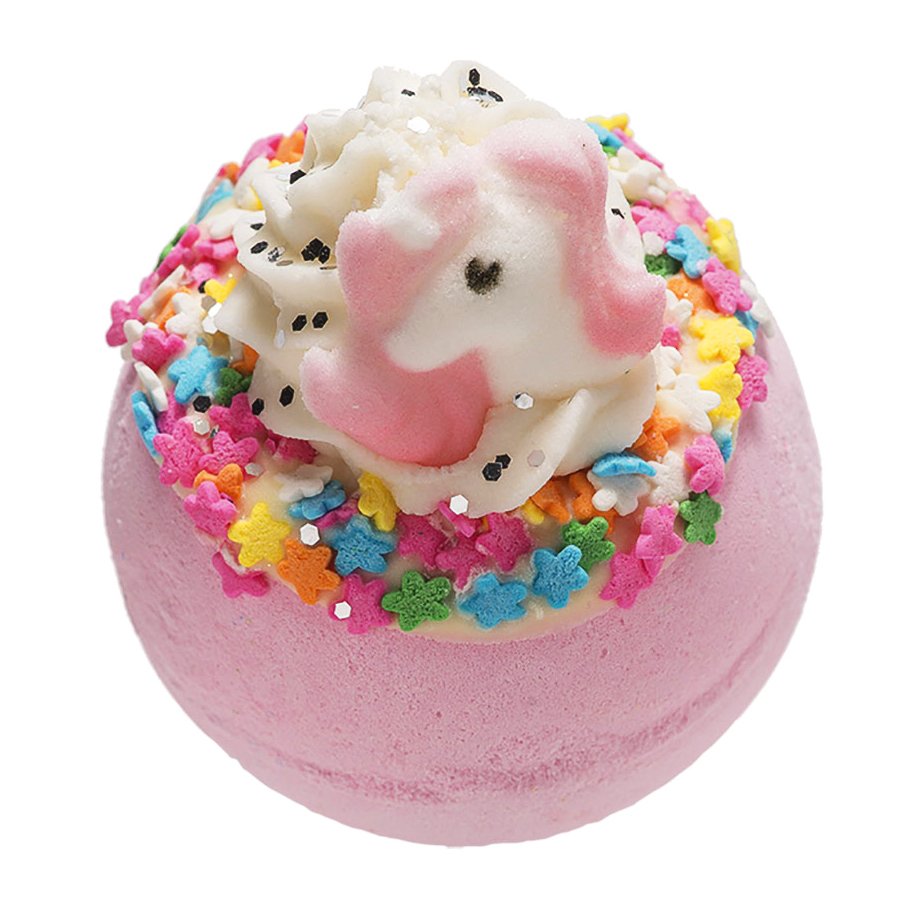 Cette bombe de bain est décorée d'une mignonne licorne entourée de fleurs de toutes les couleurs de l'arc-en-ciel. La boule de bain sent bon la poire. Elle vous transportera dans le pays magique des licornes.