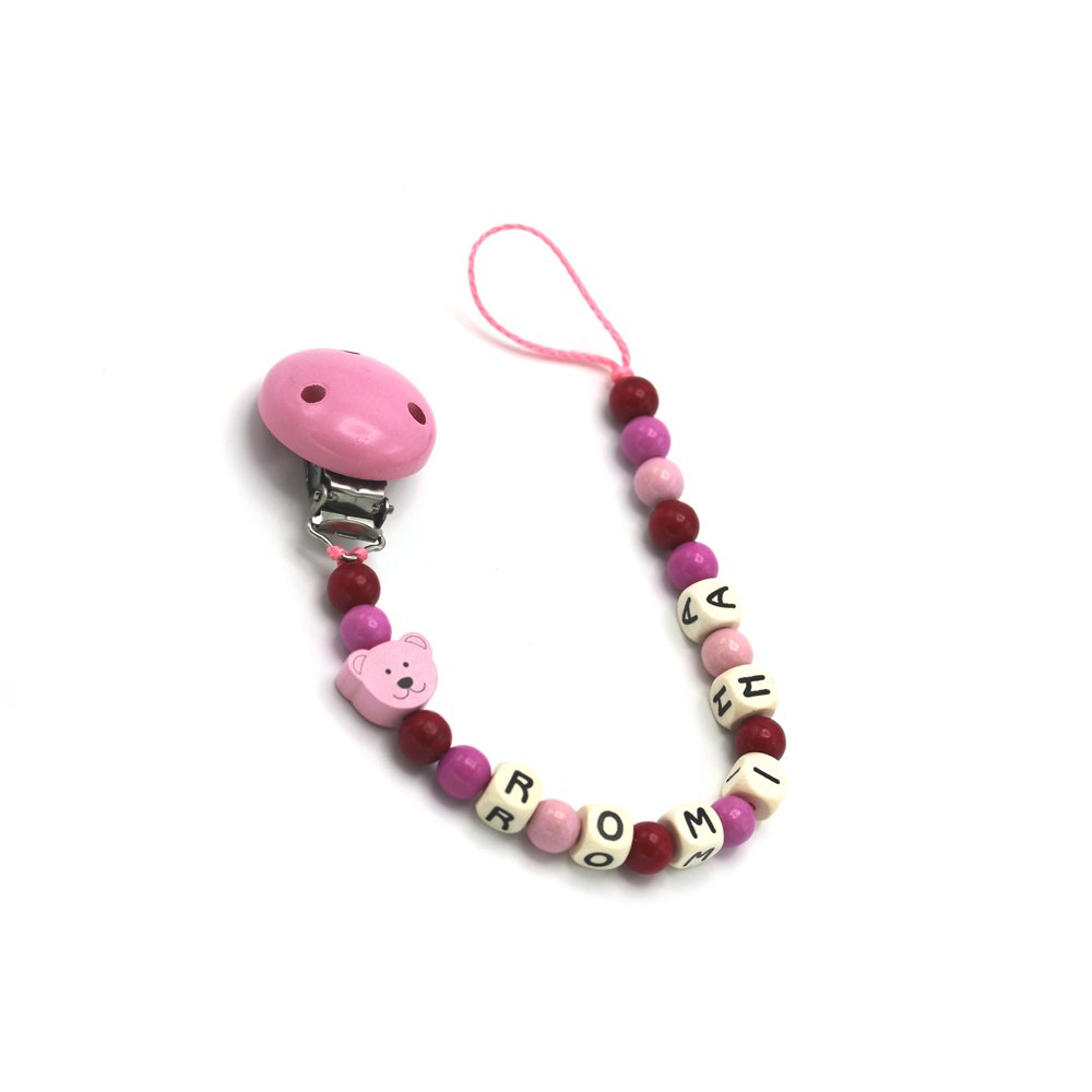 Cette mignonne attache-tétine est décorée de perles en bois et d'un petit ours. Elle peut être personnalisée avec un prénom de 10 lettres au maximum, qui seront gravées sur de petits cubes. Les lettres et les perles sont assemblées à la main. C'est un cadeau utile mais original pour une naissance ou un baptême!