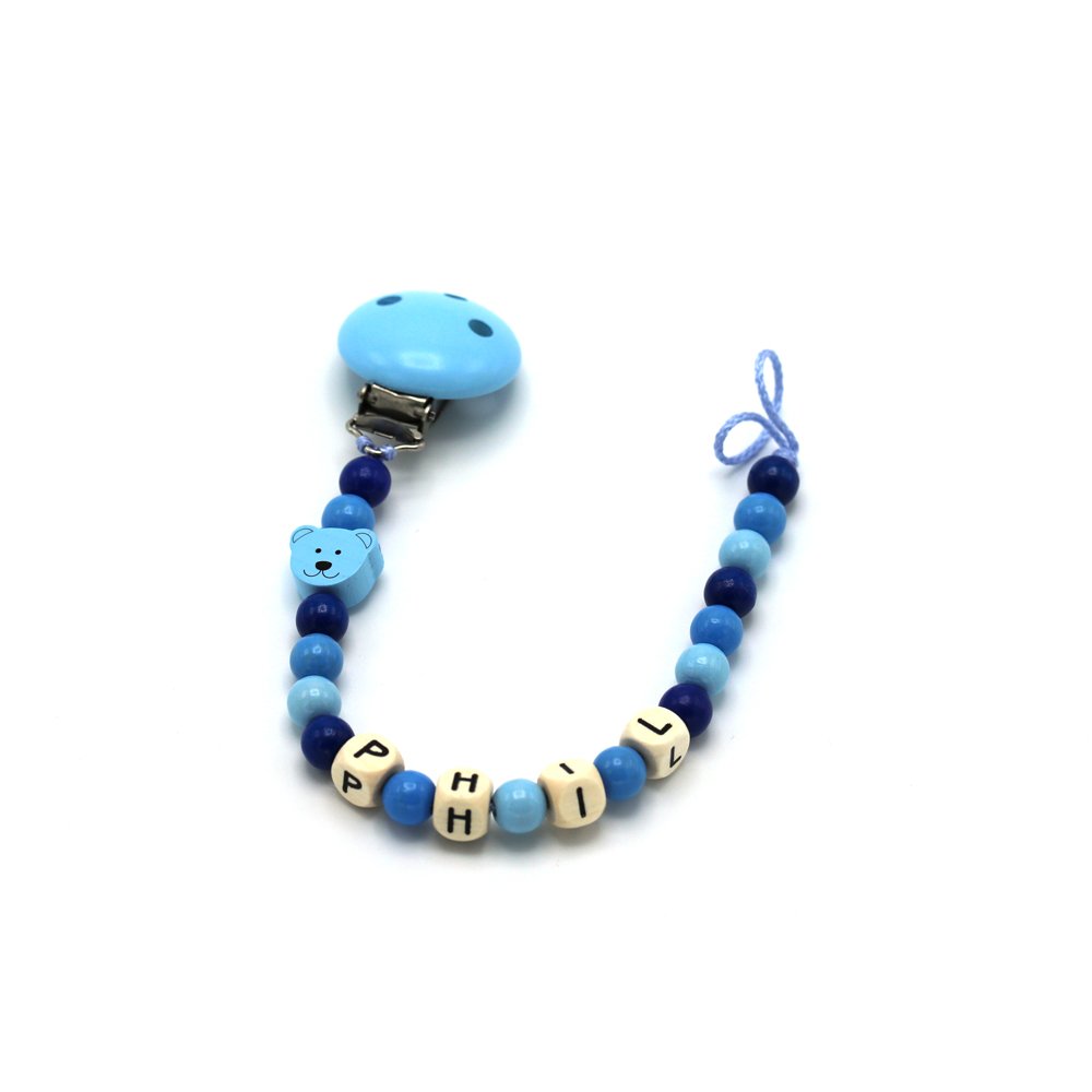 Cette mignonne attache-tétine est décorée de perles en bois et d'un petit ours. Elle peut être personnalisée avec un prénom de 10 lettres au maximum, qui seront gravées sur de petits cubes. Les lettres et les perles sont assemblées à la main. C'est un cadeau utile mais original pour une naissance ou un baptême!