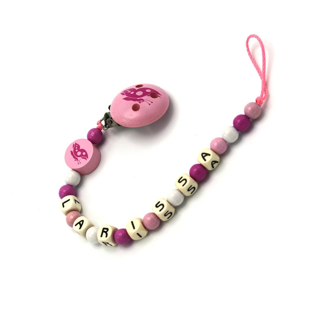 Cette mignonne attache-tétine est décorée de perles en bois et d'un petit papillon. Elle peut être personnalisée avec un prénom de 10 lettres au maximum, qui seront gravées sur de petits cubes. Les lettres et les perles sont assemblées à la main. C'est un cadeau utile mais original pour une naissance ou un baptême!