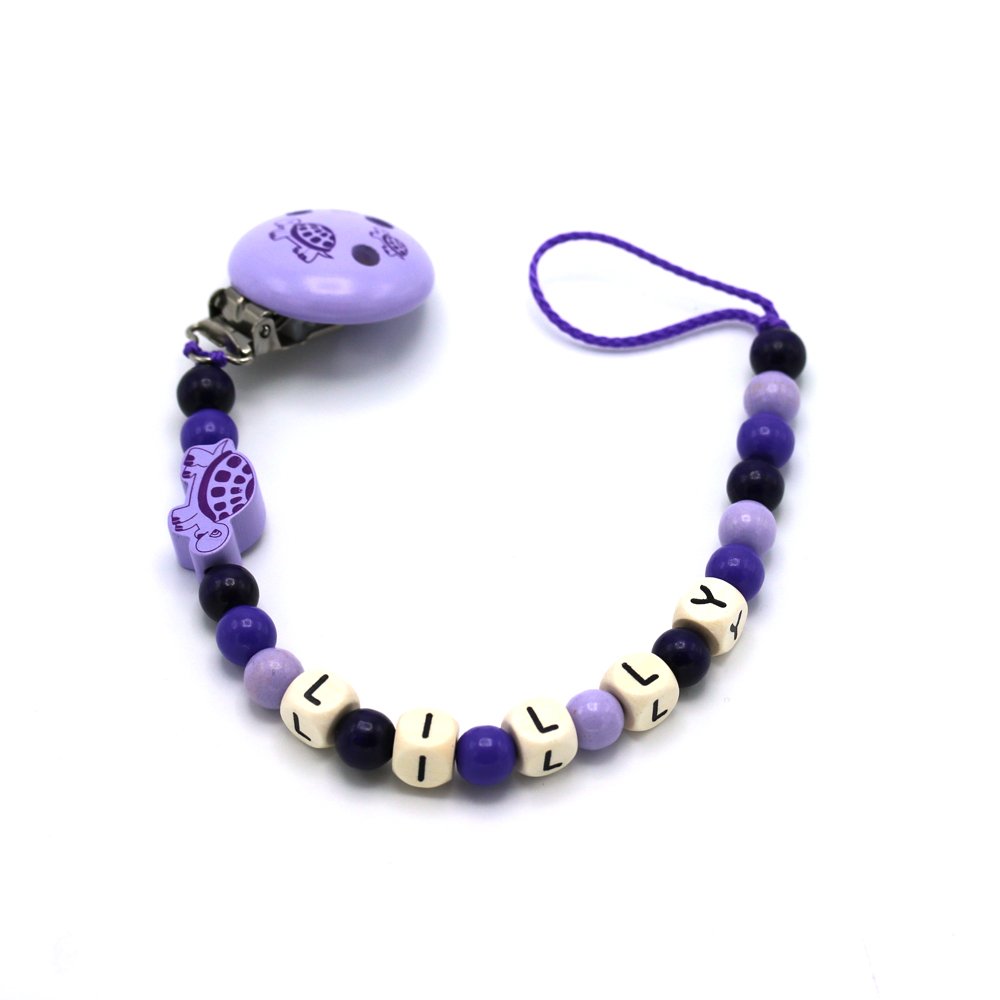 Cette jolie attache-tétine est décorée d'une tortue et de perles en bois de couleur violette. La «chaînette» peut être personnalisée un prénom de 10 caractères maximum, qui seront gravés sur de petits cubes blancs. Les perles et les lettres en bois sont enfilées à la main. Le bois ne contient pas de substance toxique et résiste à la salive. C'est un cadeau utile mais original pour une naissance ou un baptême!