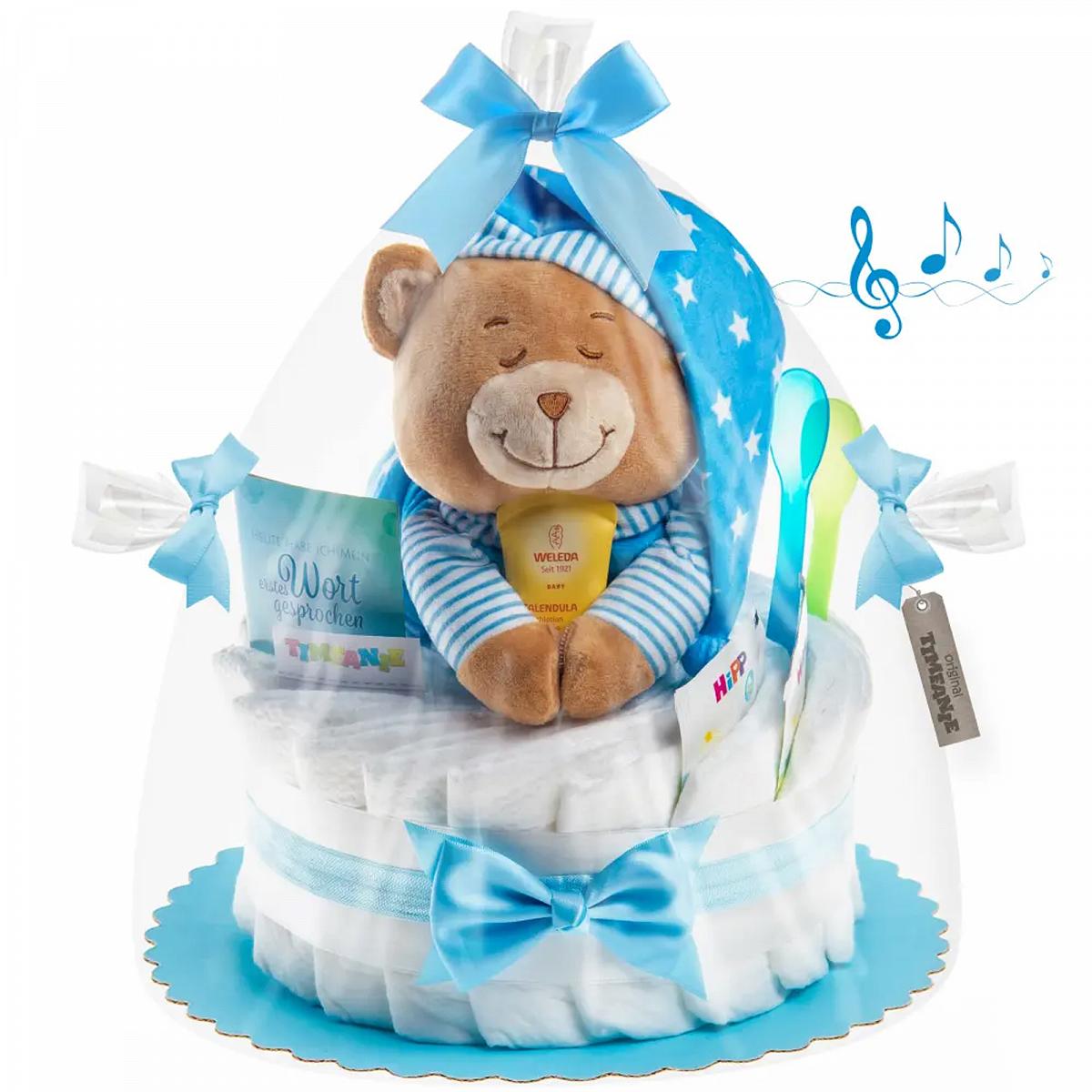 Un cadeau classique revisité! Ce magnifique gâteau de couches fabriqué à la main renferme plein de produits de qualité. L'ensemble comprend un nounours musical, une carte de vœux, du thé bio pour bébé Hipp, une cuillère Babynova et un shampooing pour bébé Weleda Et 20 Pampers Premium. Le tout est emballé dans un papier transparent et garni d'un ruban de satin bleu.