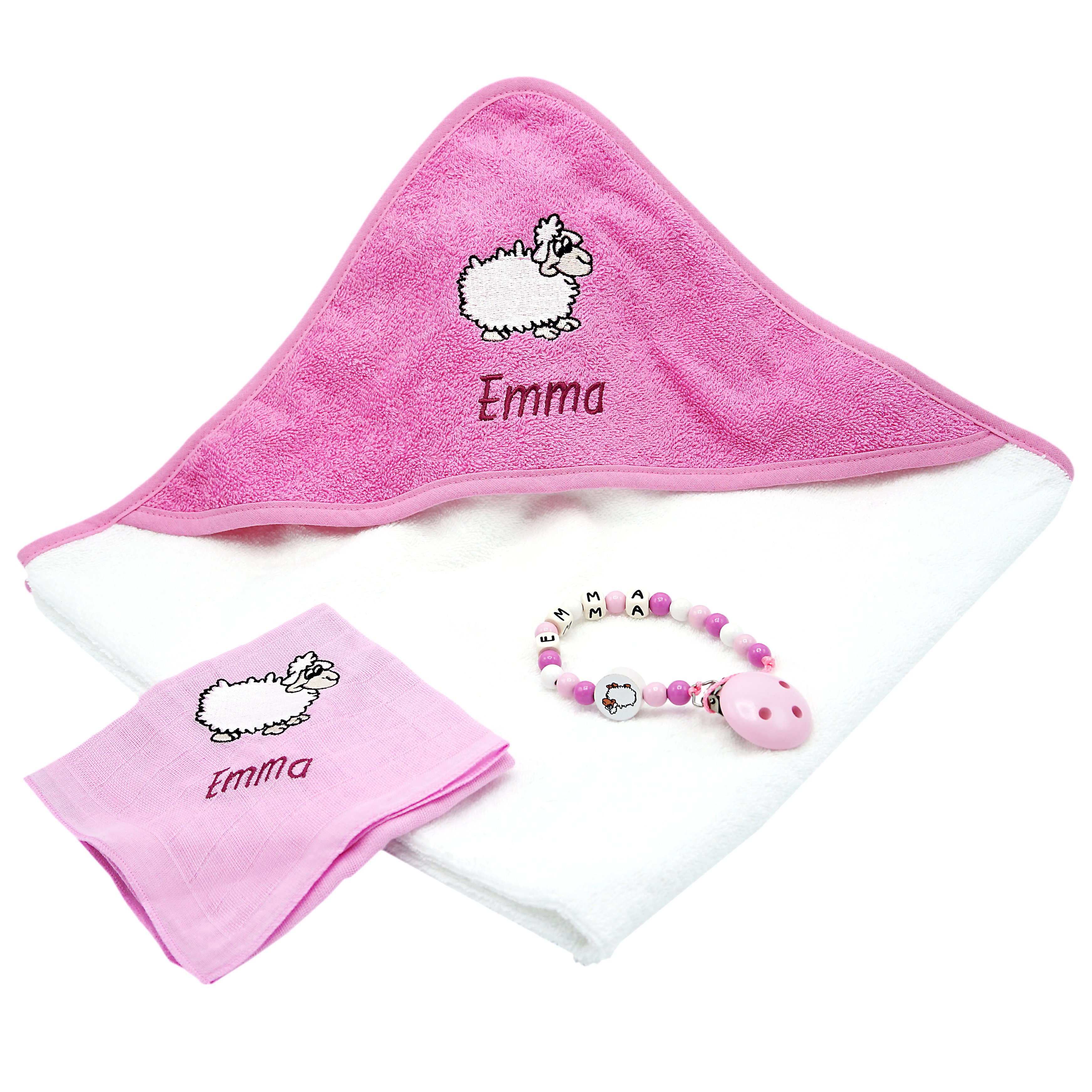 Tu cherches le cadeau de naissance idéal ? Le voici ! Ce set contient une sortie de bain à capuche, un lange et une attache-tétine, tous décorés d’un adorable petit mouton. Ces trois objets dans les tons roses sont personnalisables avec le prénom de Ton choix (max.10 caractères). Un cadeau utile qui ravira les heureux parents à la naissance ou à l'occasion d'un baptême !