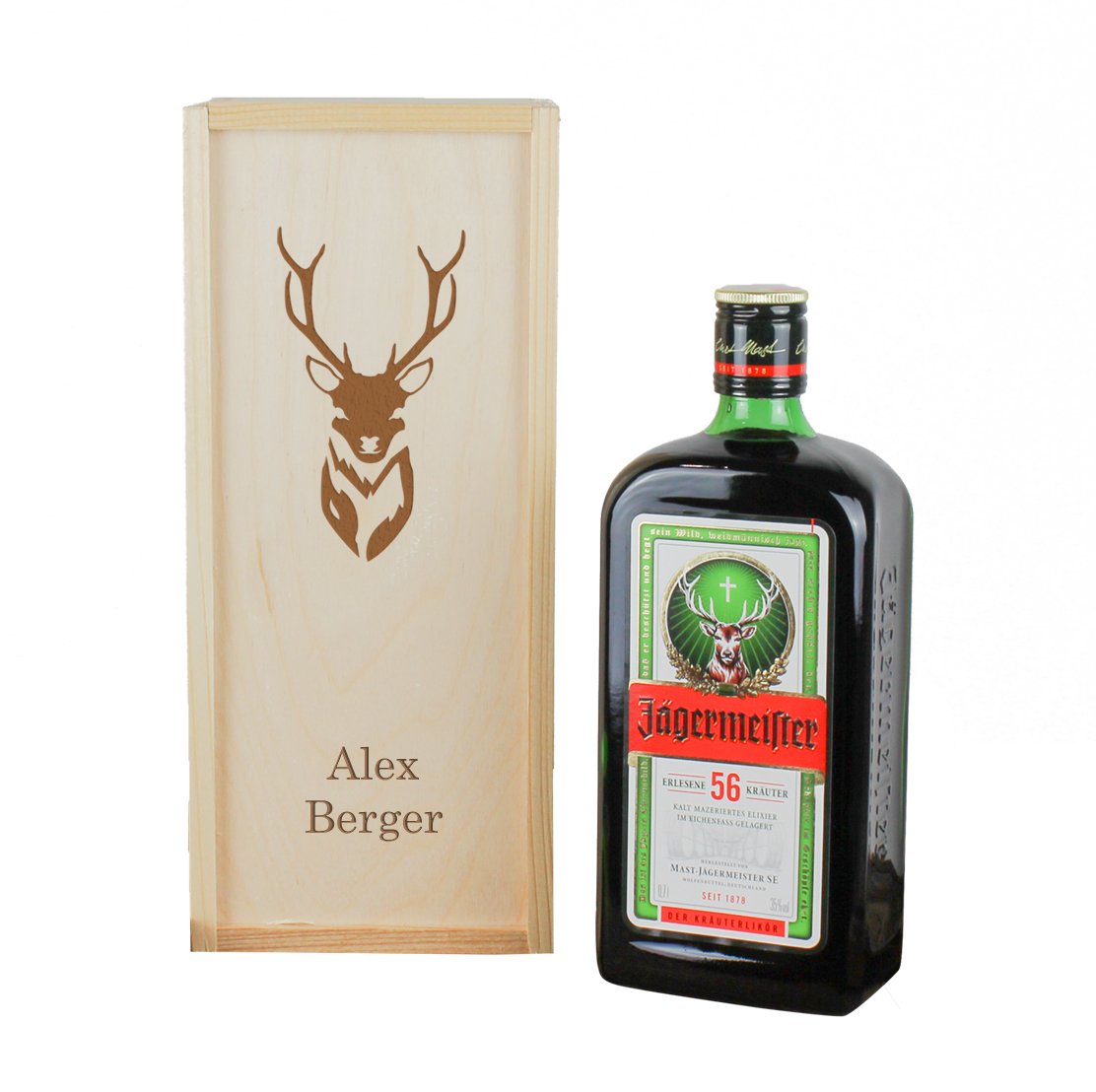 Grâce à sa forme carrée, son logo représentant une tête de cerf et son étiquette orange, la bouteille de Jägermeister est connue dans le monde entier. Celle-ci est emballée dans une boîte personnalisable équipée d'une fermeture magnétique.