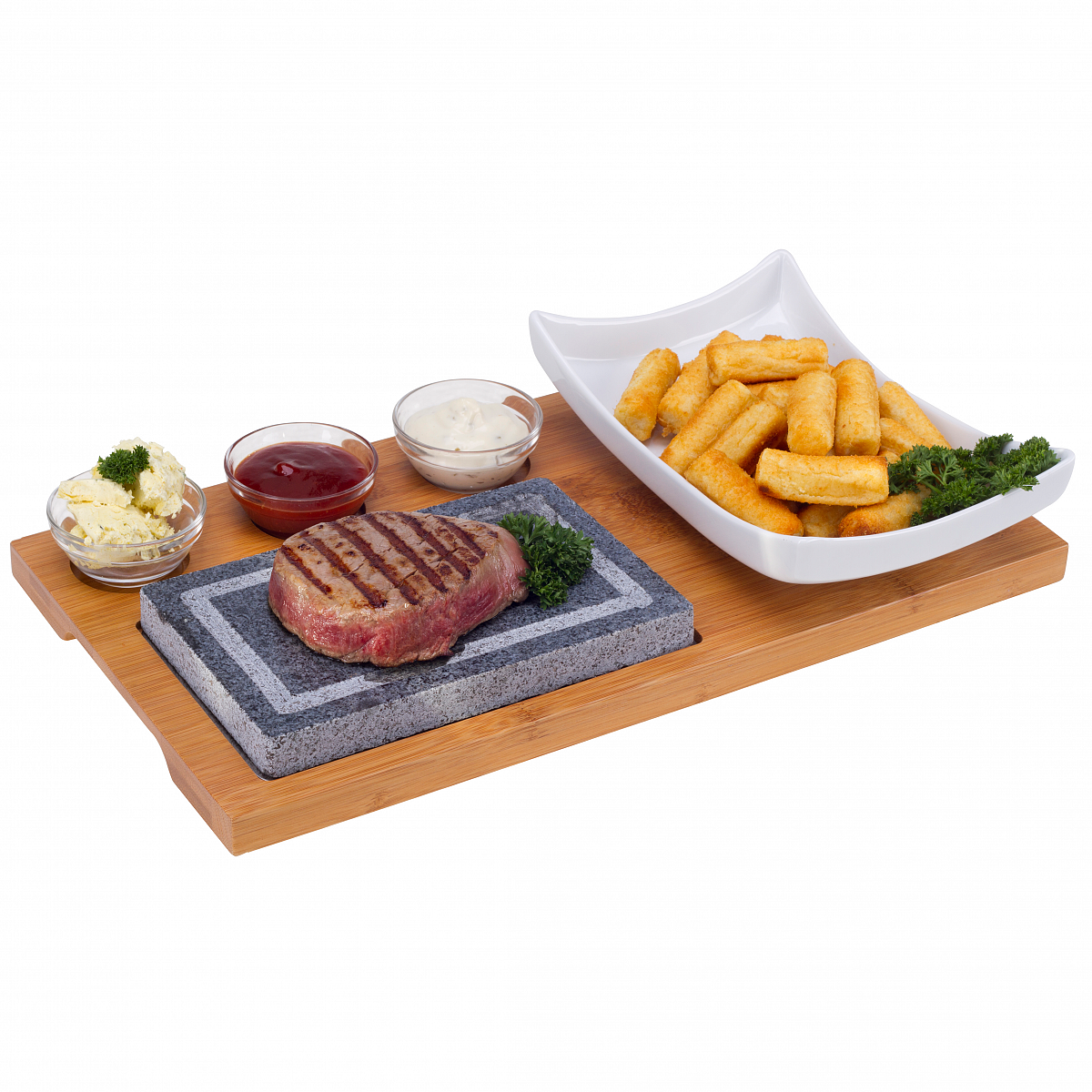 Régale tes invités avec un steak bien juteux servi sur une pierre chaude et accompagné d’une portion de frites croustillantes ! Ce set se compose d'une planche en bois, de 3 petits pots pour les sauces, d'une pierre à cuire et d'une assiette pour les frites (ou tout autre accompagnement). Le cadeau idéal pour les amateurs de viande.