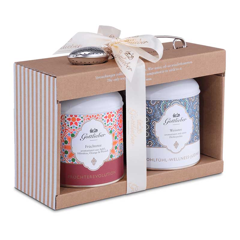 Savourez deux thés remarquables de Gottlieber et évadez-vous. Cet ensemble se compose de l’infusion fruitée "Fruit Revolution" et d’un thé blanc relaxant "Miraculous Wellbeing Tea". Les deux boîtes enchanteresses sont accompagnées d'un infuseur à thé en acier inoxydable pour que vos mélanges de thé puissent être facilement infusés et dégustés. Pour des moments de plaisir et de détente.