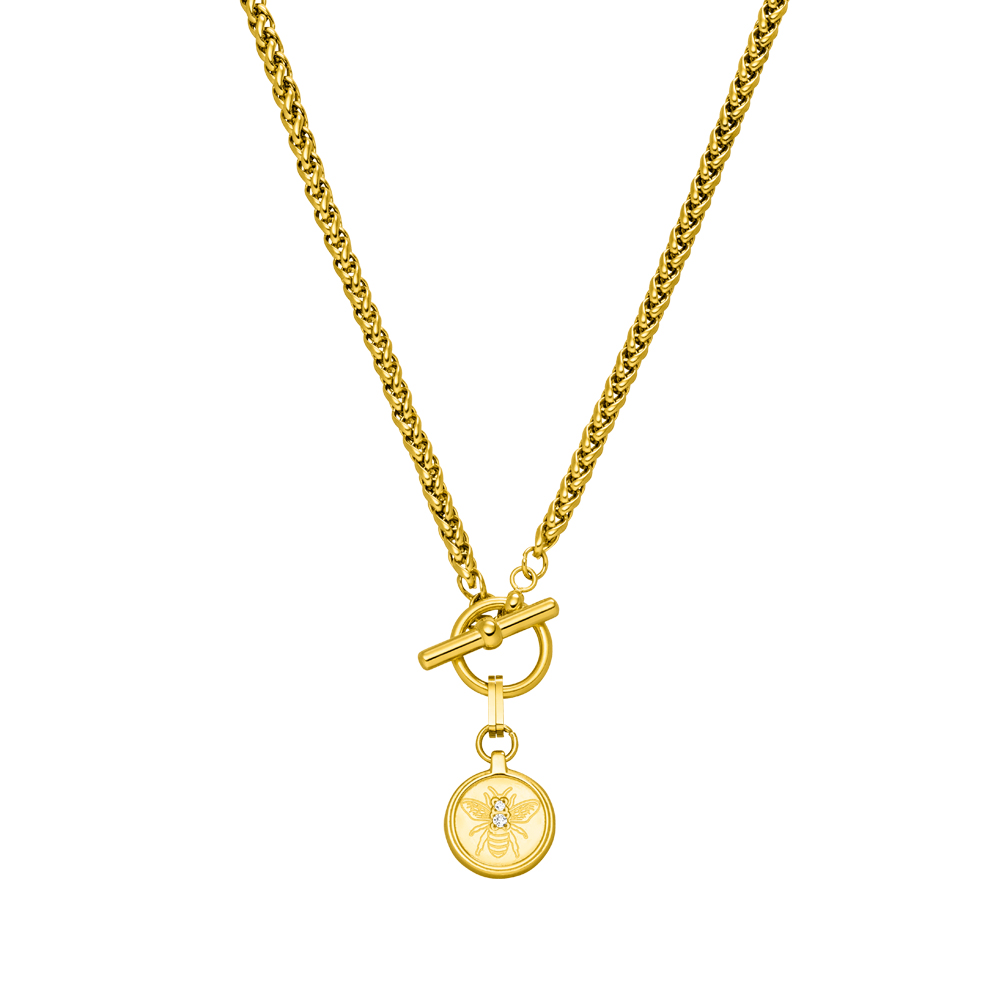 Le collier Purelei Lele avec son superbe médaillon gravé à l’effigie d’une d'abeille est un splendide bijou. À porter seul ou en superposition avec d’autres chaînes. Le pendentif est orné de deux pierres étincelantes et attaché à un fermoir en T comme les pièces de haute joaillerie. Voici la touche élégante qui complètera à merveille votre tenue. Idéale pour les grandes occasions et les journées spéciales.