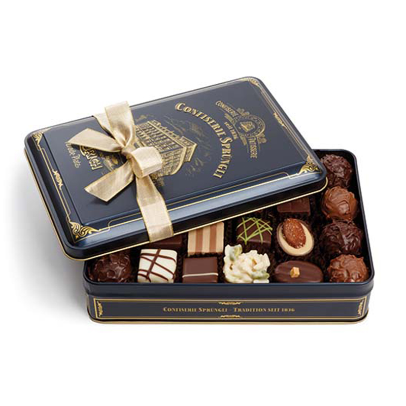 La Maison Sprüngli est une boîte nostalgique remplie d'une sélection de délicieux pralinés et de savoureuses truffes, fabriqués à partir de chocolat suisse et d'ingrédients naturels. Fabriqué selon les recettes traditionnelles de la célèbre confiserie Sprüngli où l'artisanat est préservé par une équipe de spécialistes. On y fait mûrir les recettes pendant des décennies en y apportant la créativité nécessaire pour les mettre au gout du jour. Forte d'une tradition de plus de 180 ans, l'entreprise familiale fait fondre les amateurs de chocolat avec ses délicieuses créations.