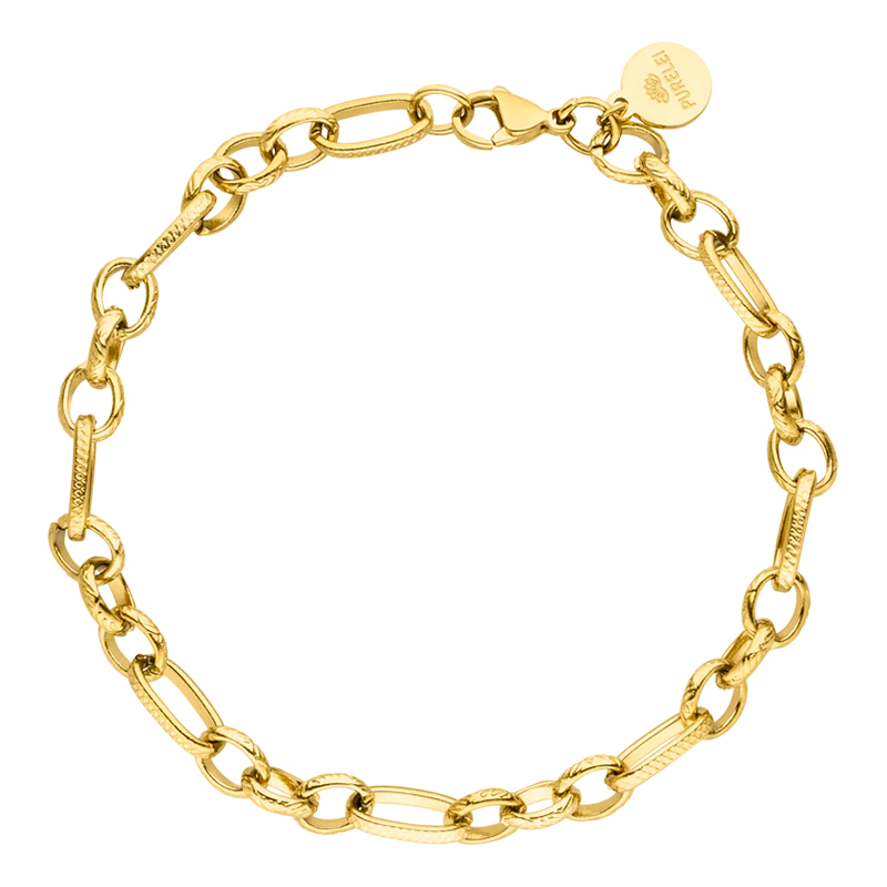 Avec le bracelet Purelei Fashion Show Gold, vous êtes totalement à la mode. Le bracelet en maille séduit par son design intemporel qui alterne entre mailles rondes et mailles ovales ciselées en surface. Massif, mais peu encombrant, ce bracelet est très agréable à porter et ses maillons invitent à la superposition.