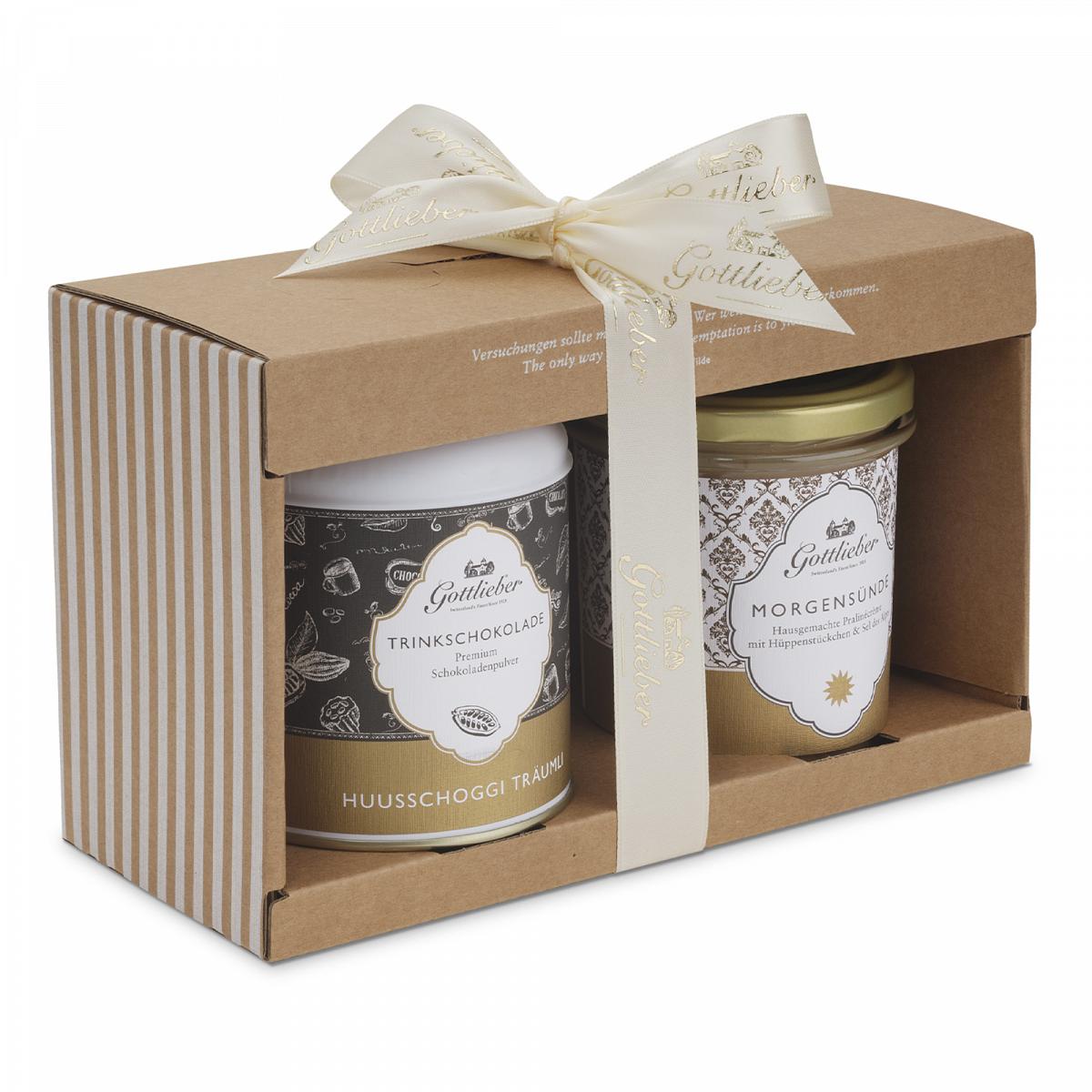 Ce très apprécié duo pour le petit-déjeuner est un indispensable pour bien commencer la journée ! Composé de "Morgensünder" et de "Huusschoggi Träumli" : une pâte à tartiner pralinée “délice du matin” avec des morceaux de gaufrette et du sel des Alpes et du chocolat en poudre artisanale pour préparer un délicieux chocolat chaud maison. Y a-t-il meilleur accompagnement au petit-déjeuner pour mettre l'eau à la bouche des amateurs de chocolat et réunir tous les gourmands ? Emballé avec amour et relevé par un élégant ruban, cet incroyable duo est un cadeau d’exception pour célébrer les moments de bonheur intenses, même le matin !