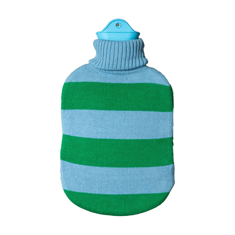 Bouillotte bleue en latex naturel avec une housse rayée bleu ciel et vert en coton biologique. La housse en tricot est incroyablement douce et ne gratte pas. Avec ses compositions de couleurs tendance, cette bouillotte trouve aussi bien sa place au lit que sur le canapé.