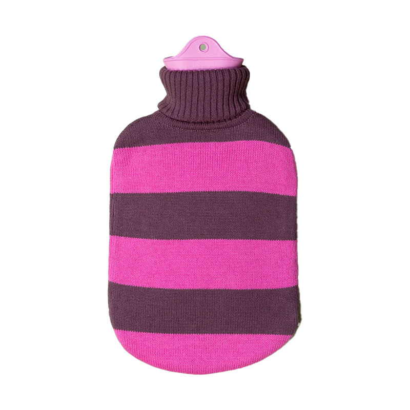 Bouillotte rose en latex naturel avec une housse rayée rose et prune en coton biologique. La housse en tricot est incroyablement douce et ne gratte pas. Avec ses compositions de couleurs tendance, cette bouillotte trouve aussi bien sa place au lit que sur le canapé.