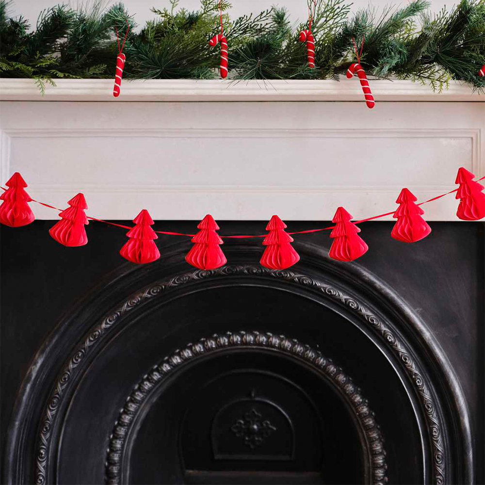 Ajoutez une touche élégante à votre dessus de cheminée ou à votre arbre de Noël avec cette étonnante guirlande en nid d'abeille d'un rouge intense. Les 10 ravissants sapins rouges en papier sont répartis sur cette guirlande de 2 mètres pour transformer votre maison en un chef-d'œuvre de décorations pour les fêtes.