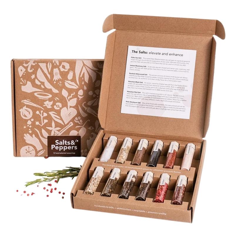 - Eine handverlesene Auswahl von 6 Salz- und 6 Pfeffersorten in eleganten Glasfläschchen.
