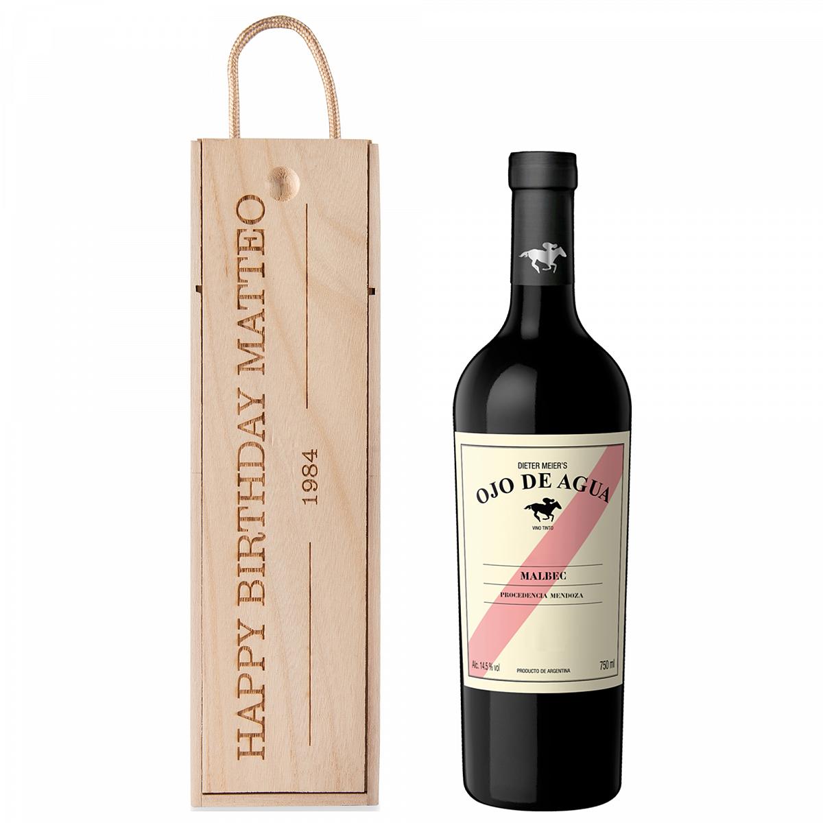 - Caisse de vin en bois personnalisable avec le vin Ojo de Agua Malbec, biologique 0,75 l