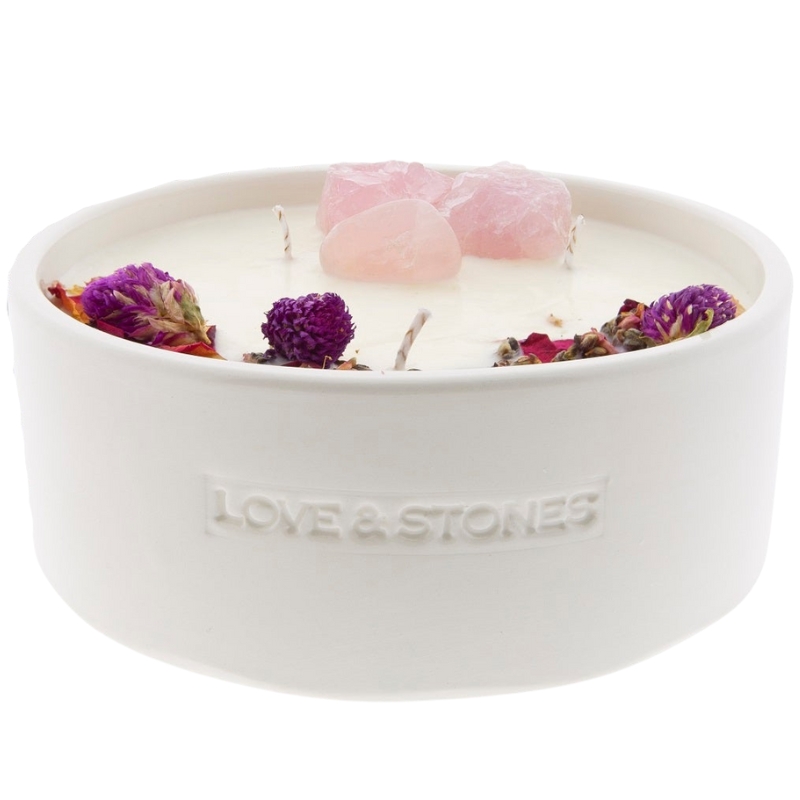- Matériaux : cire de soja 100% naturelle, cristal de quartz rose, fleurs sauvages bio séchées, céramique