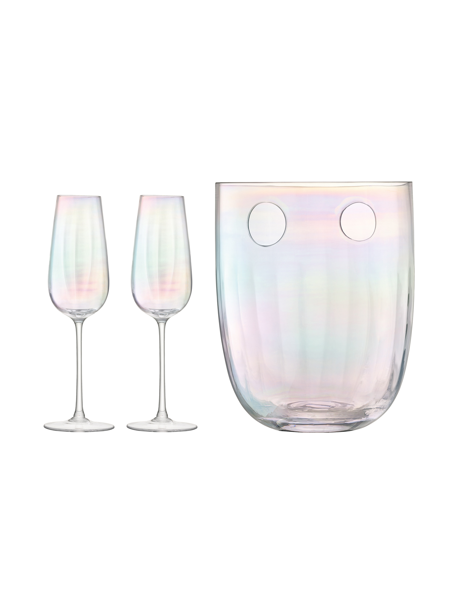Deux flûtes à champagne et un seau refroidisseur, soufflés à la bouche pour créer une texture subtilement rainurée. Les verres sont peints avec une brillance nacrée pure et s'accordent parfaitement avec le champagne, qui brille comme une pierre précieuse scintillante.