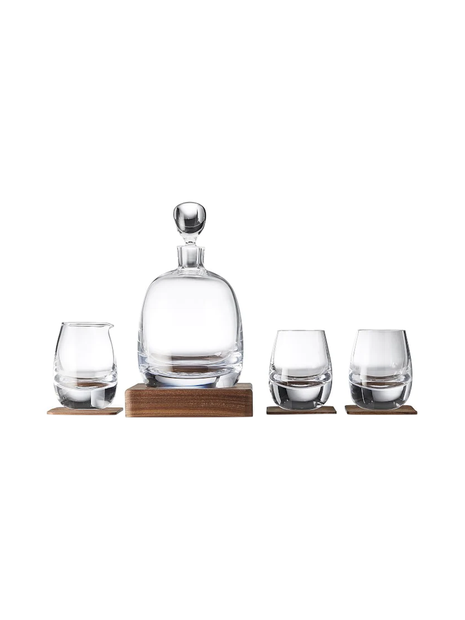 Ce set combiné se compose d’une carafe avec base en noyer, d’un pichet avec sous-verre et de deux gobelets avec sous-verres.