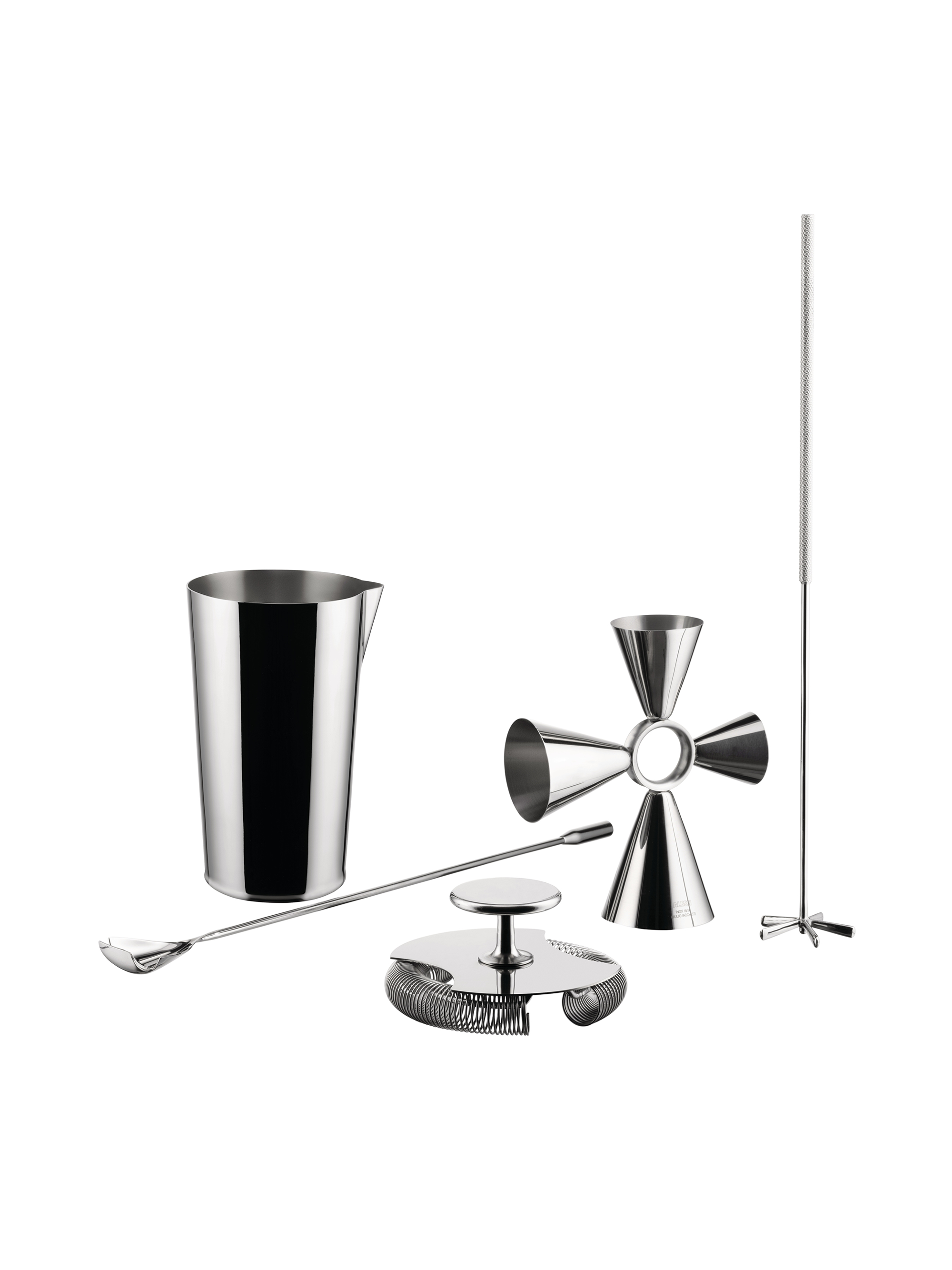 Ce set de préparation de cocktails a été conçu par Giulio Iacchetti en collaboration avec le mixologue Oscar Quagliarini et se compose de six objets : shaker à cocktail, passoire à bar, verre à mélanger, doseur à cocktail, cuillère à mélanger et fouet à bar.