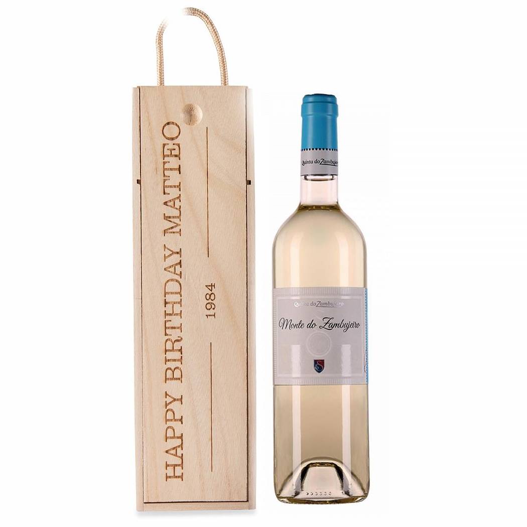 Ce coffret personnalisable contient une bouteille de vin de l'exquis Monte do Zambujeiro Branco de l'Alentejo. Ce vin enthousiasme par ses notes vives d'agrumes, ses nuances de pamplemousse et un soupçon d'arômes de fleurs blanches. Sa fraîcheur juteuse et citronnée donne de la vivacité au vin blanc, tandis que le fruit délicieusement persistant et la fine note d'herbes en fin de palais offrent une expérience de dégustation rafraîchissante. Parfait pour accompagner les fruits de mer, les planches apéritives de l’été et les salades. Ce vin est conditionné dans un coffret en bois personnalisable pour une bouteille de vin. La face avant peut être personnalisée avec la gravure sur bois du texte de votre choix.