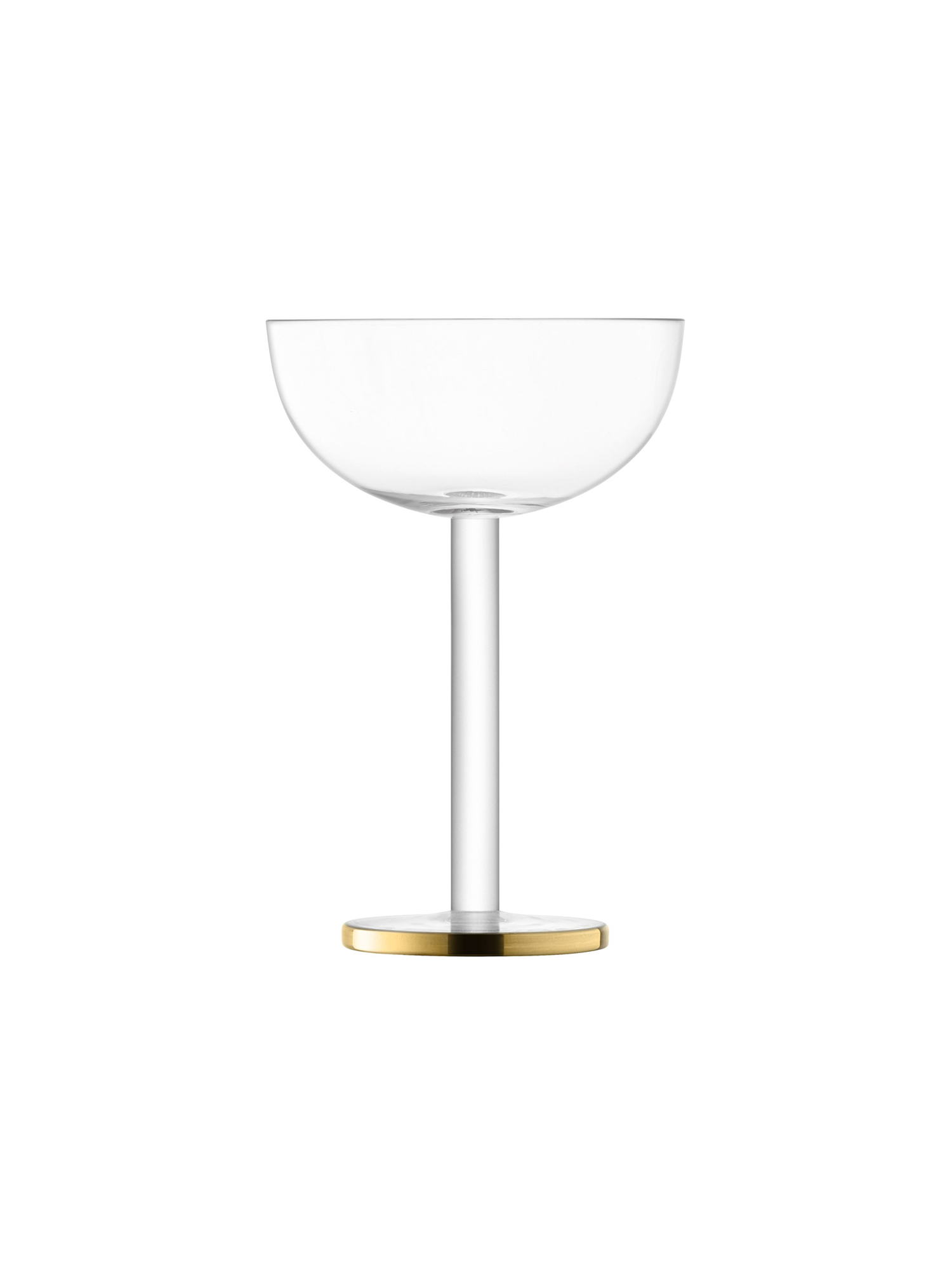 Une paire de coupes modernistes en verre soufflé bouche avec un décor métallique discret. Le bol rond et le pied épais en forme de tube créent une silhouette moderne. Idéales pour le champagne et les cocktails.
