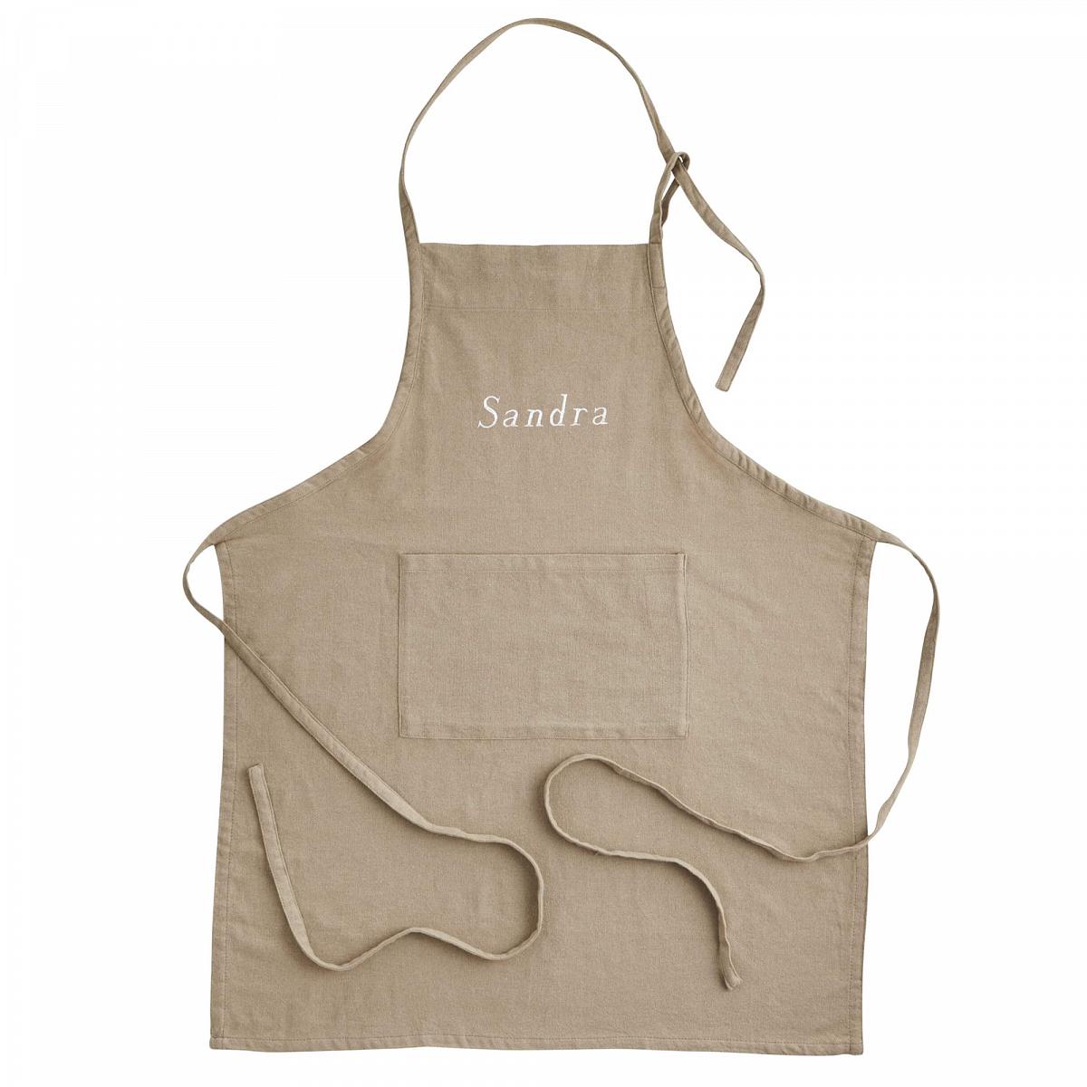 Ce tablier personnalisable de couleur marron clair est fabriqué à partir de fil de coton 100 % recyclé et tissé sur un métier à tisser manuel traditionnel. Brodé individuellement au nom de votre choix, c’est le cadeau idéal pour les épicuriens, les cuisiniers amateurs ou les maitresses de maisons soucieuses de l'environnement. En l'achetant, vous soutenez une cause sociale et durable.