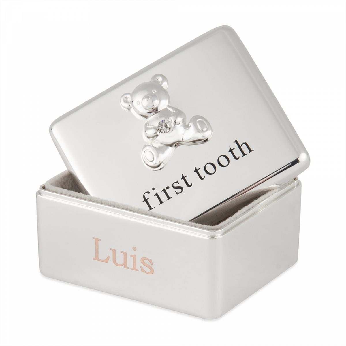 La boîte personnalisée ''first tooth'' est parfaite pour conserver la première dent d’un enfant ou toute autre première fois. La boîte en métal plaqué argent 925 est décorée d'un petit ours étincelant et de l'inscription ''first tooth''. Le prénom de l’enfant sera gravé sur le côté de la boîte, faisant de ce cadeau, un souvenir élégant qui accompagnera l’enfant toute sa vie.