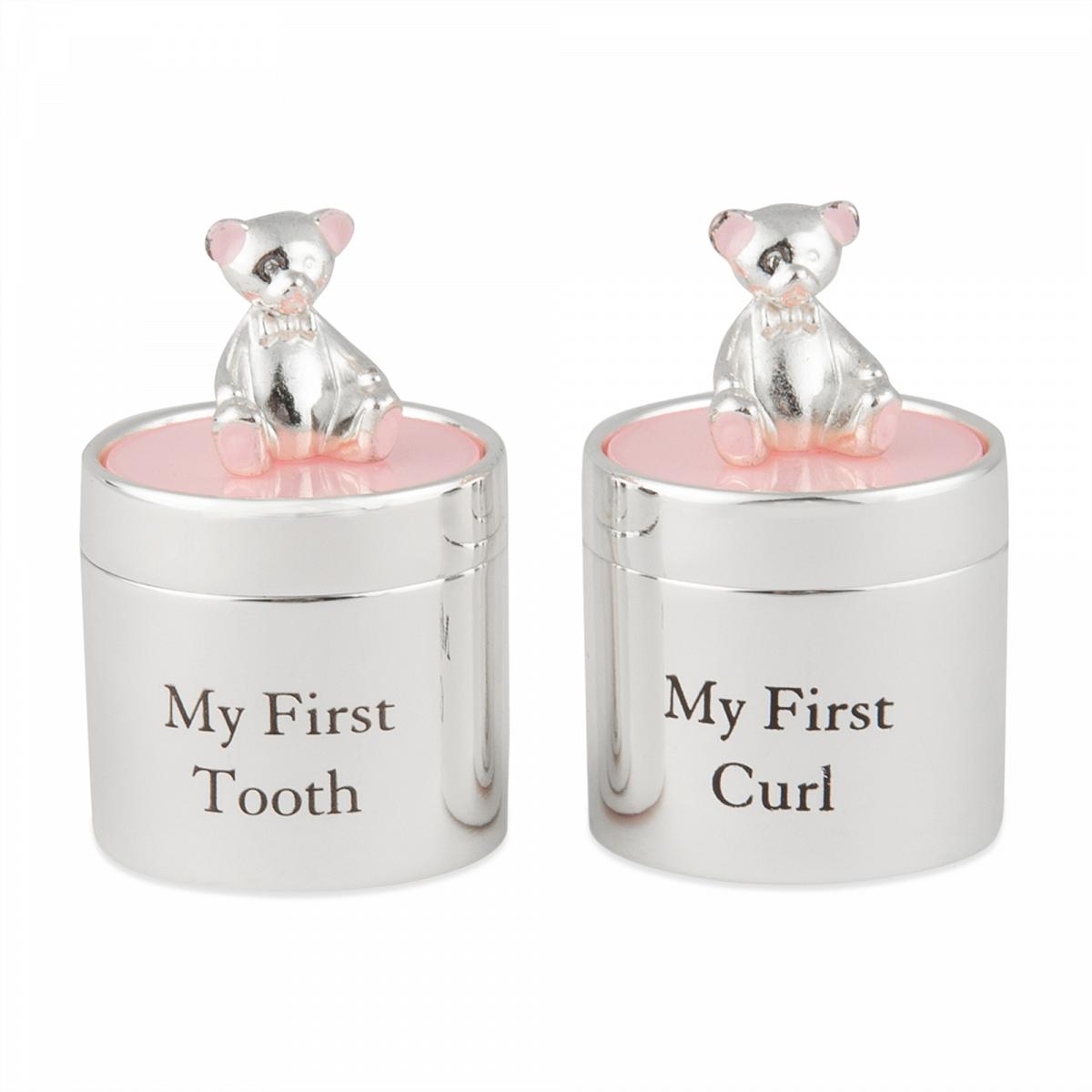 Les boîtes en métal argenté surmontées d'un ourson sont un cadeau intemporel qui ravira les nouveaux parents. Ce duo de boites permet de conserver élégamment les premiers souvenirs de leur enfant. Chaque boite est accompagnée de son couvercle laqué rose et porte les inscriptions 'my first tooth' pour l’un et 'my first curl' pour l’autre. La première lettre du prénom du nouveau-né est gravée au dos de chaque boite pour faire de ce coffret, un souvenir unique et intemporel qui accompagnera l’enfant toute sa vie.