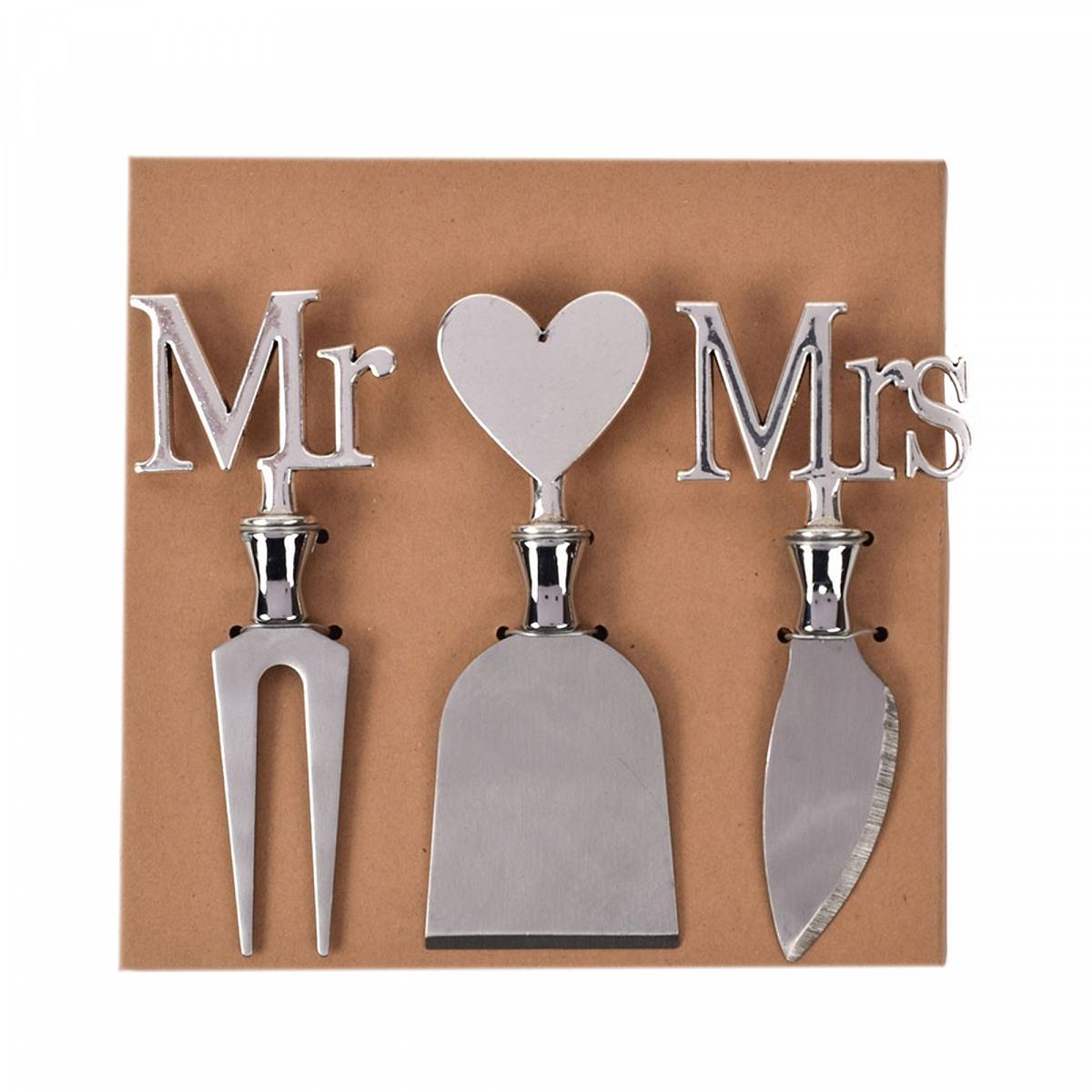 Ce set de couteaux à fromage argenté au design magnifique est un must-have dans la cuisine de chaque couple de mariés. Il se compose de deux élégants couteaux à fromage et d'un pic à fromage avec les inscriptions 'Mr', 'Mrs' et un design en forme de cœur, ce qui fait de ce set le cadeau idéal pour un couple de mariés chic !