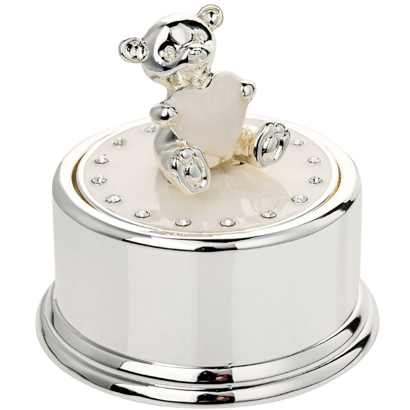 Plongez dans l'univers enchanteur des chambres de bébé avec cette irrésistible boîte à musique plaquée argent et surmontée d’un ourson. L’élégante boite à musique est en métal argenté pour un aspect encore plus étincelant. Assis sur le couvercle se tient un adorable petit ours tout mignon, un cœur entre les pattes. N’est-ce pas touchant?