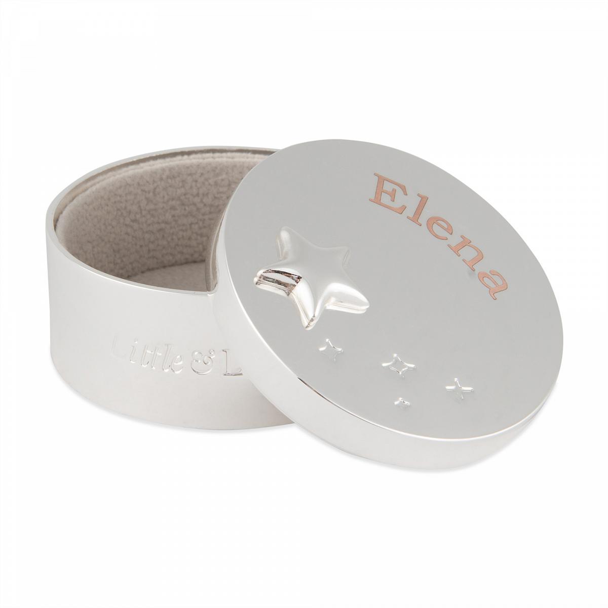 Cette boite à dents de lait étincelante et personnalisable est un accessoire charmant pour la chambre d'un enfant. Sa petite taille, Son design en forme d'éToile et l'inscription 'Little & Loved' la rendent parfaite pour y conserver les souvenirs les plus précieux. Grâce à la gravure du nom de votre choix sur le couvercle, vous transformez la boîte plaquée argent en un souvenir unique et intemporel qui accompagnera l’enfant toute sa vie.