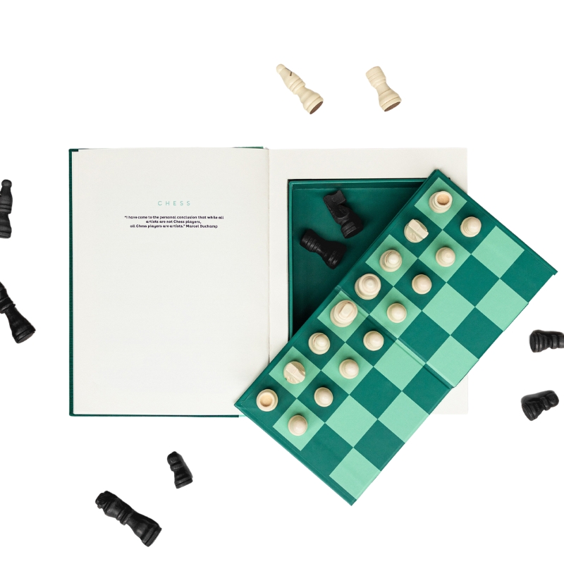 Ce livre à couverture rigide cache entre ses pages un échiquier et toutes les pièces de jeu. Parfait pour un rangement discret sur une étagère ou à côté d'autres livres sur la table basse.