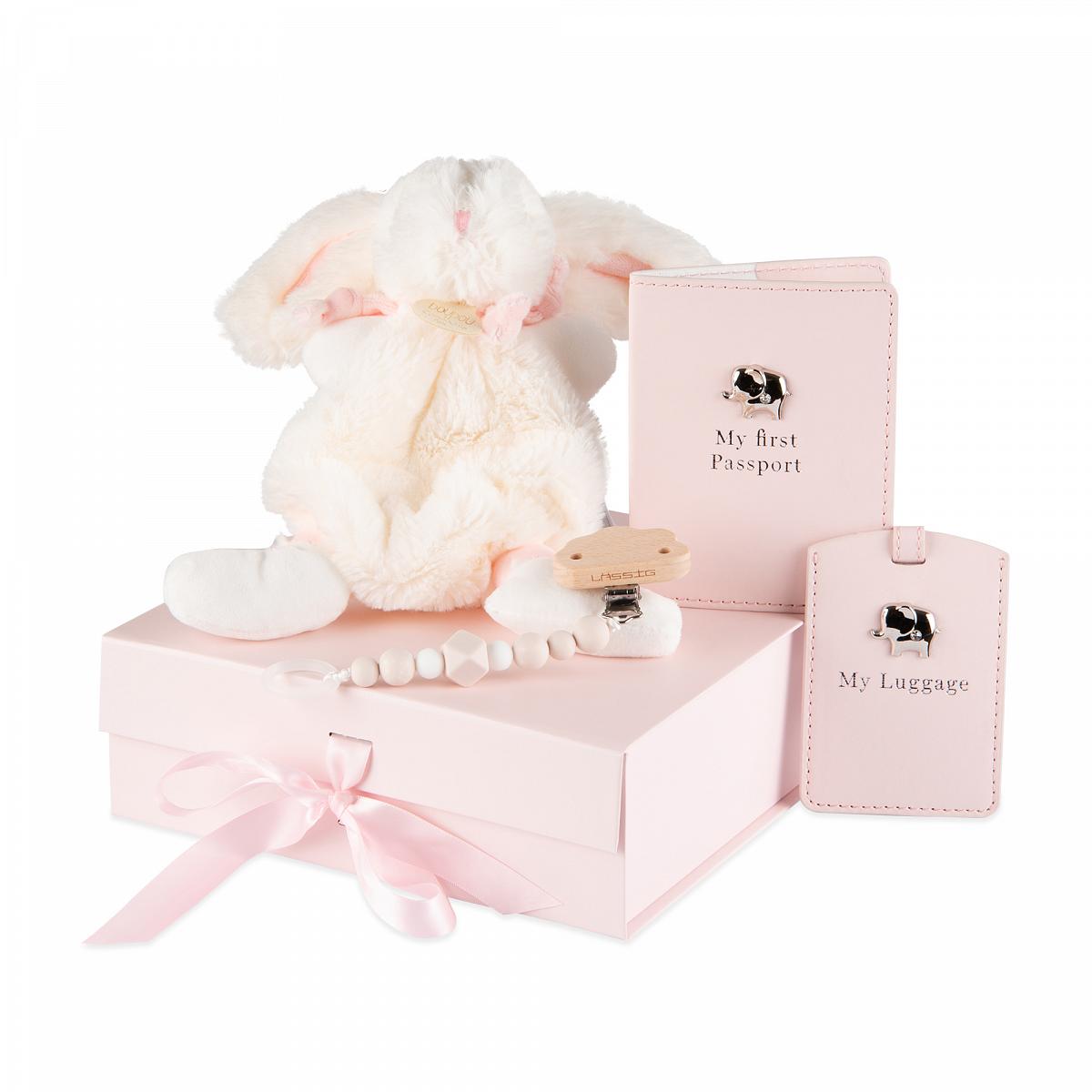 Ce coffret-cadeau de naissance rose contient un assortiment de produits de qualité pour célébrer la venue au monde du petit ange. Le doudou lapin tout doux accompagnera le nouveau-né dès son premier jour et l’accroche tétine de la collection Little Universe évitera de la perdre pendant ses nombreuses activités d’exploration. Le set comprend un porte-passeport et une étiquette à bagages, décorés d'un éléphant en métal et de lettres d’argent pour les futurs voyages en famille et avoir des souvenirs du Baptême et de naissance qui restent.