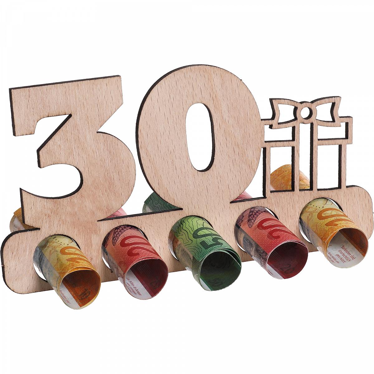 Pour souhaiter son 30ᵉ anniversaire à quelqu’un, essayez quelque chose de différent ! Ce joli portant en bois permet d’y placer l’argent que l’on souhaite offrir. Ce présentoir en bois n'est pas seulement élégant, c'est aussi une manière originale d'offrir de l'argent en cadeau. Un cadeau parfait pour une occasion des plus spéciales et un geste qui restera à coup sûr dans les mémoires !