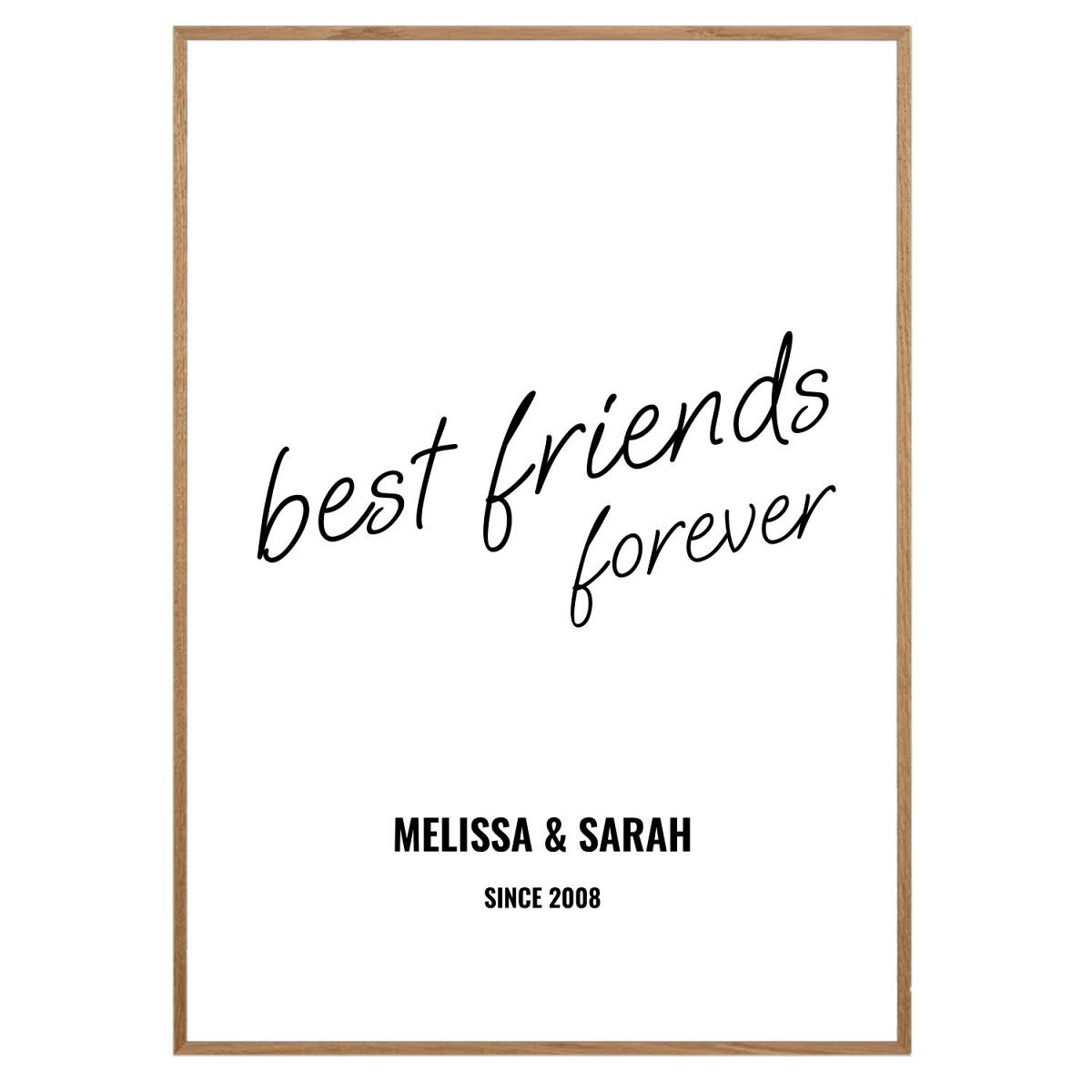 Cette affiche personnalisée « Best Friends forever » sur fond blanc au format A3 est une charmante attention qui sera du plus grand effet pour votre meilleur.e ami.e. Rehaussé d’un élégant cadre en chêne naturel, ce poster apporte style et chaleur à votre intérieur. Un cadeau qui souligne et honore votre amitié de manière particulière.