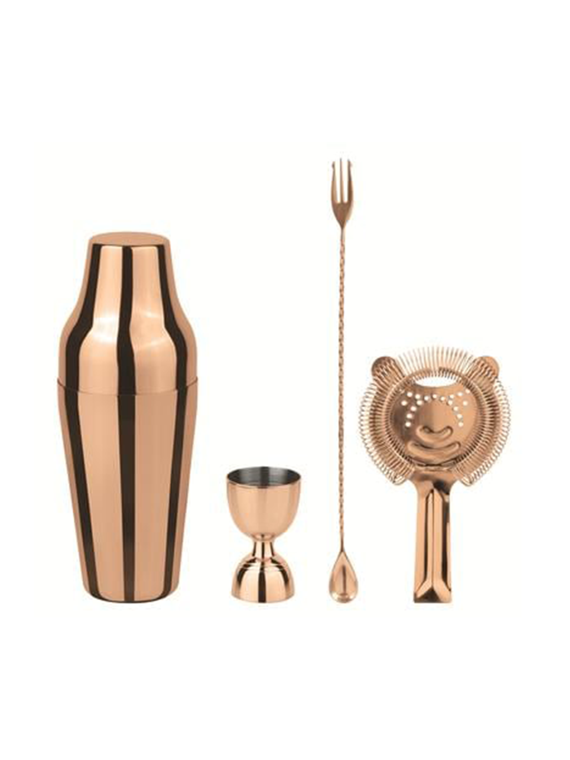 Obtenez l'accessoire parfait pour la préparation de cocktails à la maison avec le set de mixeur à cocktails Parisian de Paderno. Le shaker à cocktail, d'une capacité de 0,7 litre, vous permet de mélanger plusieurs cocktails à la fois, après avoir soigneusement et précisément mesuré tous les ingrédients avec le doseur. Avec le tamis, vous filtrez tous les résidus solides avant de servir. L'ensemble est fabriqué en cuivre noble et élégant, durable et résistant à la corrosion. Vous garantissez ainsi un plaisir de cocktail stylé dans votre bar à domicile, même pour l'avenir.