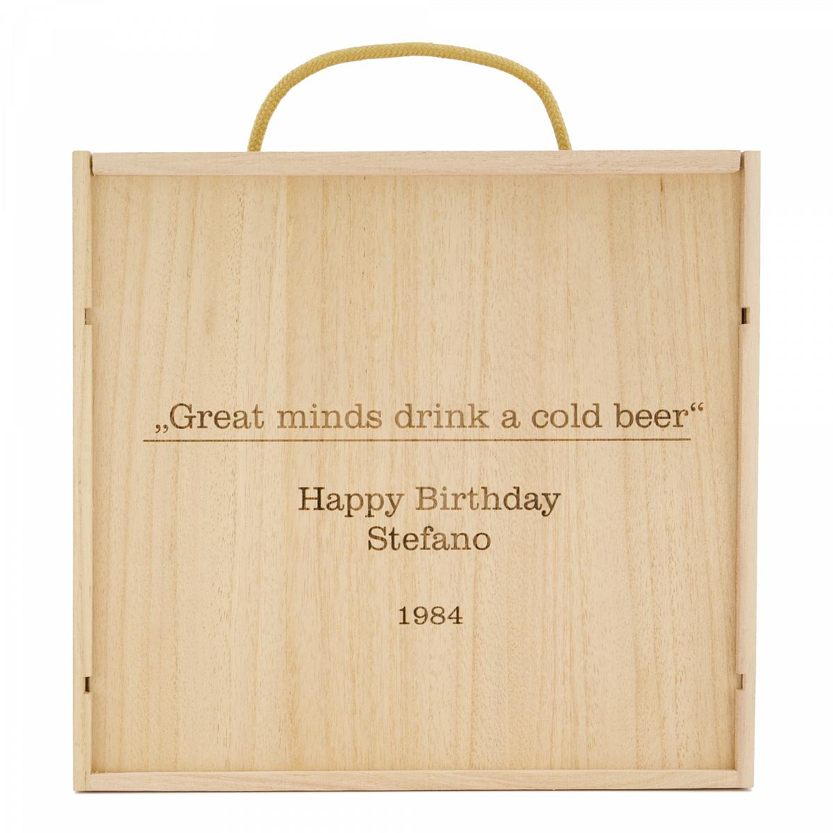 Découvrez la caisse à bière en bois personnalisable pour 4 bouteilles ! Grâce à une gravure individuelle, elle devient unique et personnelle. Réutilisable à l’infini, elle peut être remplie selon vos envies avec vos bières préférées. Pratique, durable et parfaite pour toutes les occasions. Surprenez vos proches avec un cadeau qui vient du cœur !