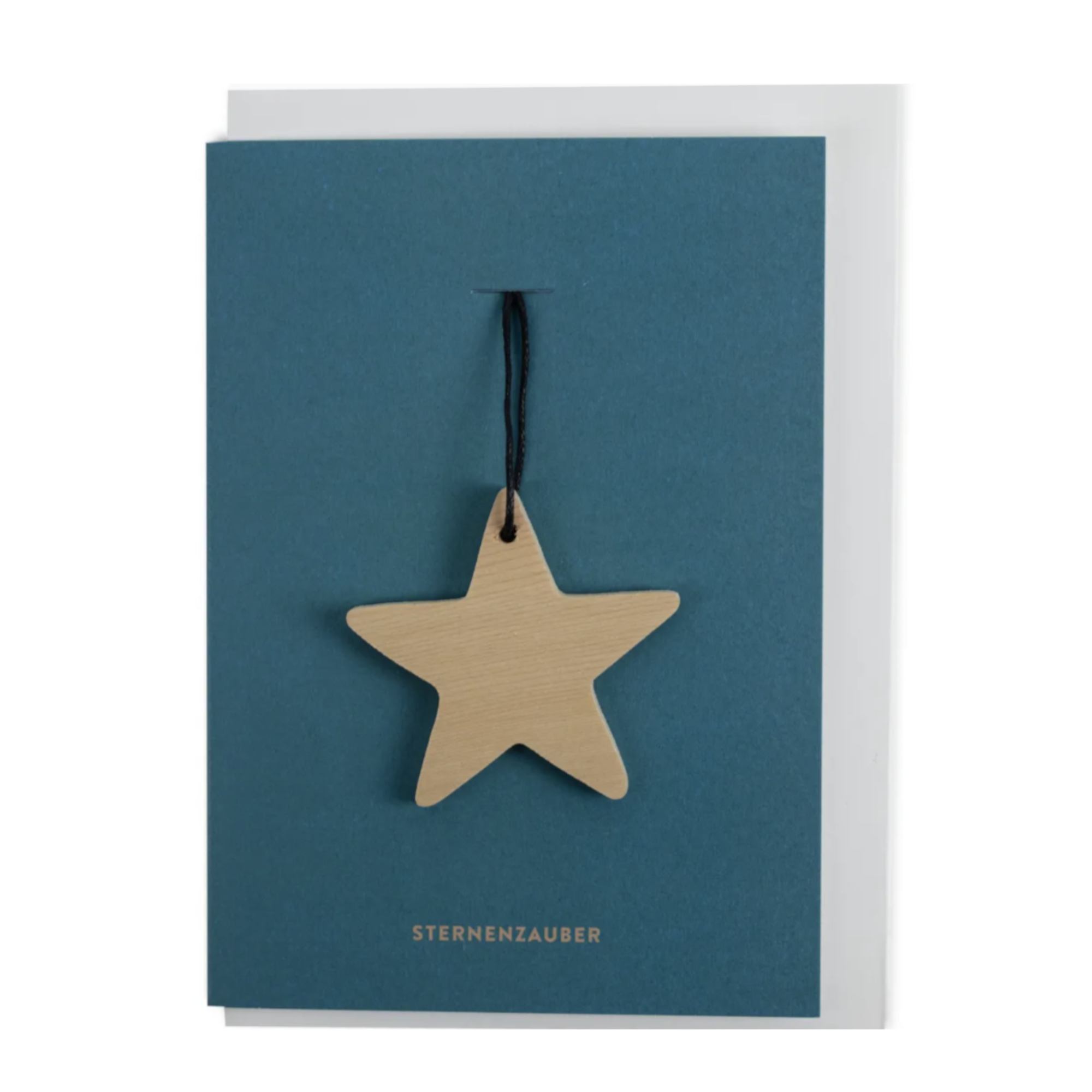 Une carte pliée unique avec un pendentif en bois d'Arve en forme d'étoile – idéale pour un message personnel et naturel. Un petit plus charmant et naturel qui pourra accompagner le destinataire pendant longtemps.