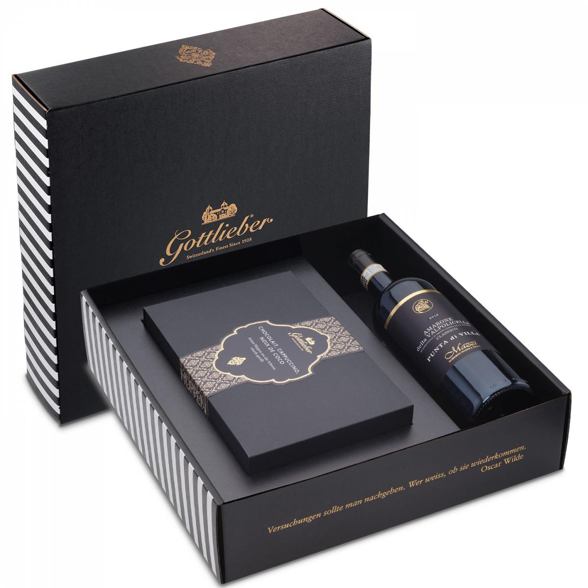 Le coffret cadeau Gottlieber Grande Italia est une sélection exclusive de délicieuses créations de Hüppen accompagnée d'une bouteille d'Amarone della Valpolicella Classico Punta di Villa DOCG. Idéal pour offrir un cadeau luxueux aux amateurs de saveurs raffinées, le set se présente dans une boîte élégante avec un ruban en satin.