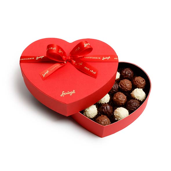 Les inimitables truffes à la crème fraîche Sprüngli, dans les variétés lait, noir et blanc, joliment rassemblées dans cette belle bonbonnière en forme de cœur.