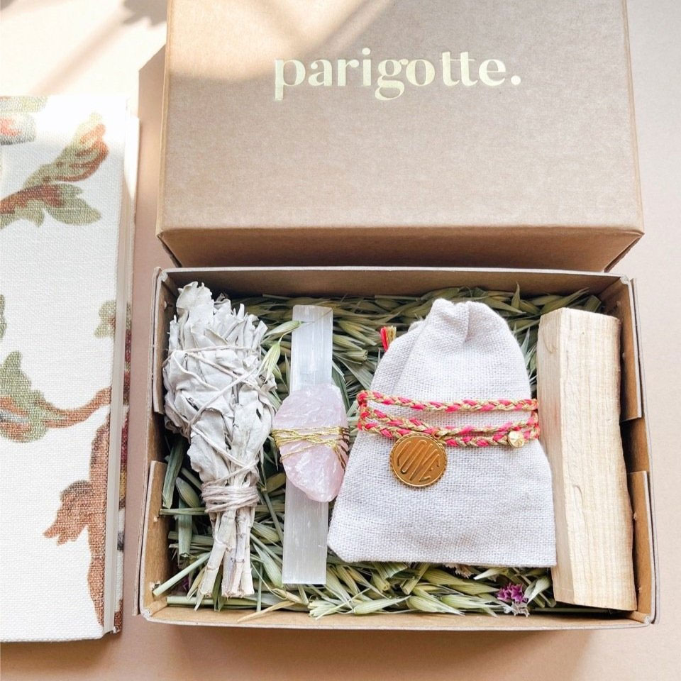 Contenu : bracelet plaqué or, cristaux de sélénite, quartz rose, bâTon de Palo Santo, bâTon de fumigation de sauge blanche de Californie