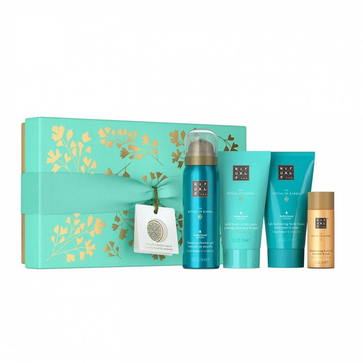 Découvrez l'énergie positive de la collection Rituals Karma. Ce coffret raffiné réunit des soins délicats infusés du parfum estival du thé blanc et du lotus sacré. Il nourrit la peau tout en offrant un rituel de bien-être relaxant. Idéal pour un cadeau ou pour s’accorder une pause bien méritée.