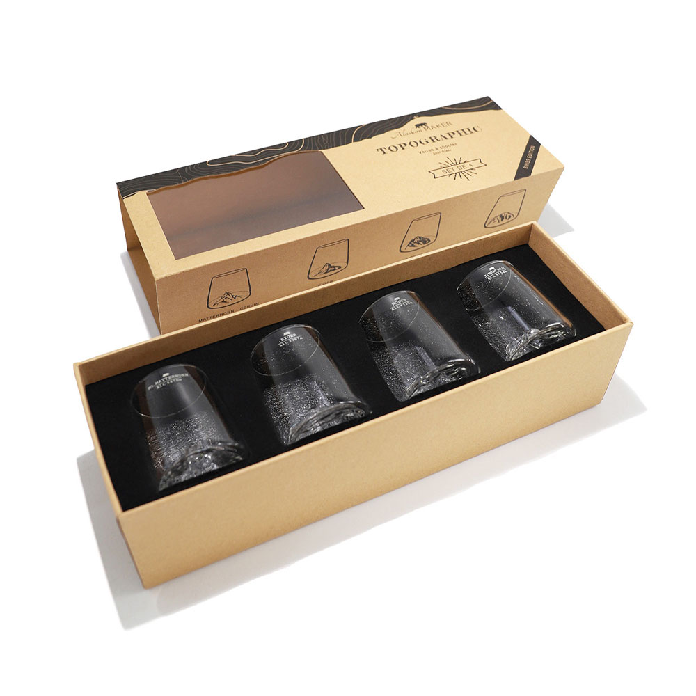 Design: Jedes Glas zeigt das detaillierte Relief eines der vier Berge: Matterhorn, Eiger, Mönch oder Jungfrau.