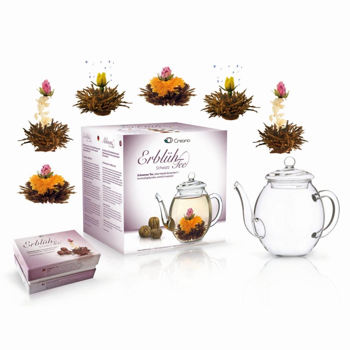 - le coffret cadeau Thé Erblüh "noir". Cette sélection spectaculaire vous fera redécouvrir le thé noir. Les 6 fleurs de thé offrent trois variantes: rose/lavande, rose/souci et rose/jasmin.