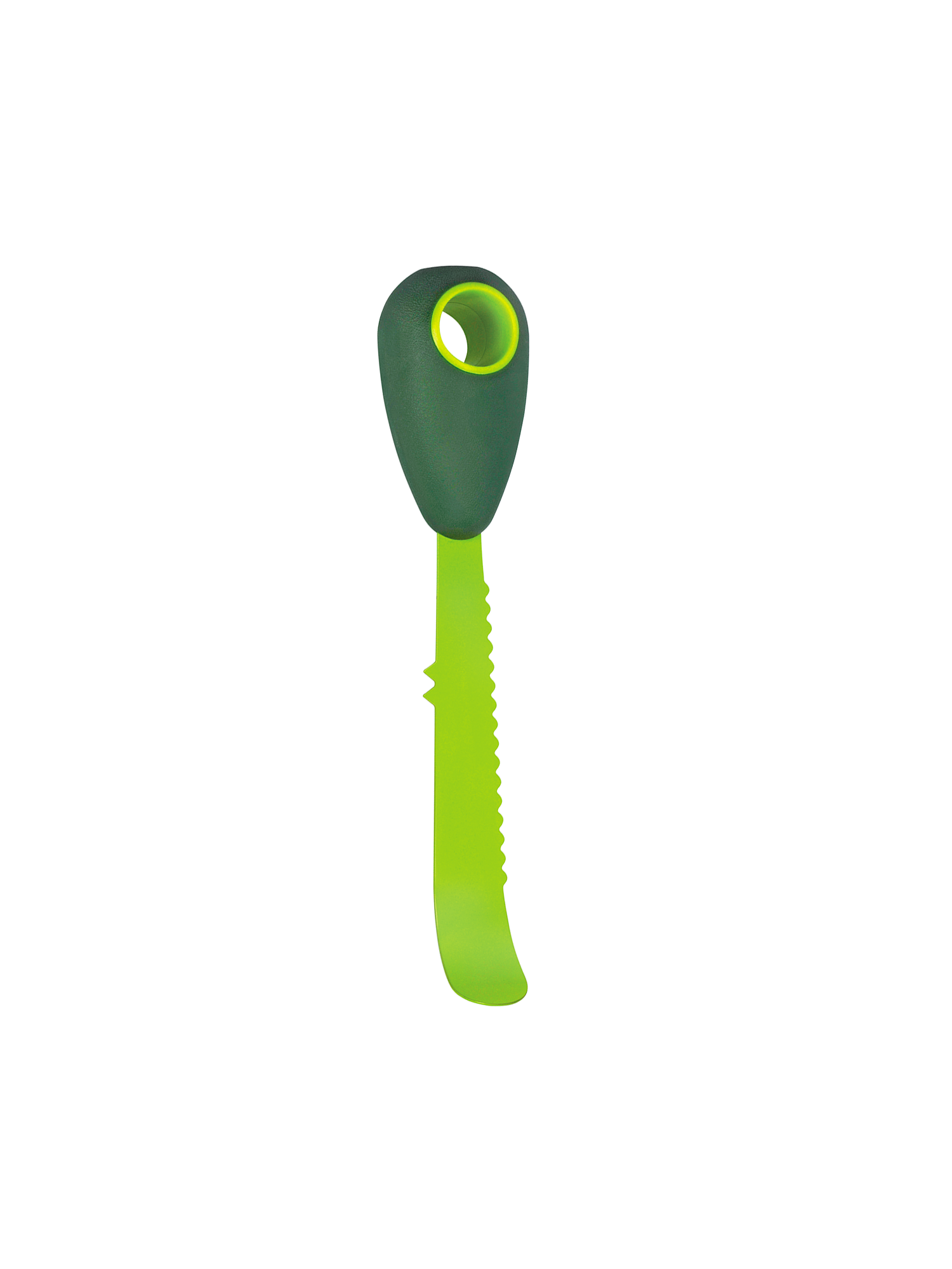 Notre couteau à avocat avec lame flexible préformée et dénoyauteur est l'arme miracle pour ouvrir, dénoyauter, peler et découper les avocats. La lame préformée, flexible et antiadhésive facilite la séparation de la pulpe et de la peau. Dénoyauteur pour retirer facilement le noyau de l'avocat. La poignée ergonomique en forme de fruit permet un travail agréable - Avec trou pour accrocher.