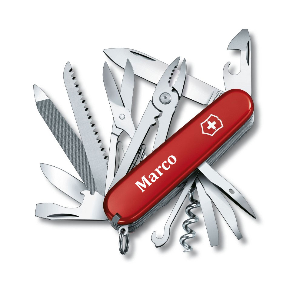 Le couteau Victorinox personnalisable Handyman est une idée cadeau pour les aventuriers et les débrouillards. Personnalisé à votre nom, le couteau Handyman de Victorinox sera bientôt votre plus fidèle ami, un outil fiable et polyvalent, que ce soit pour visser une lampe, ouvrir une boîte de conserve ou déboucher une bonne bouteille de vin.