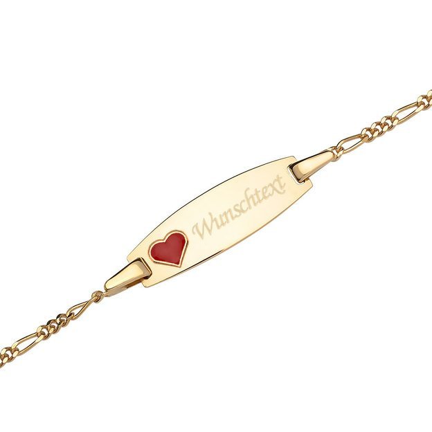 Surprenez un enfant ou ses parents avec ce joli bracelet plaqué or jaune 375. Le nom de votre choix sera gravé sur la plaque et accompagné d'un cœur rouge. Le bracelet est fourni avec une rallonge de chaine de 2 cm.