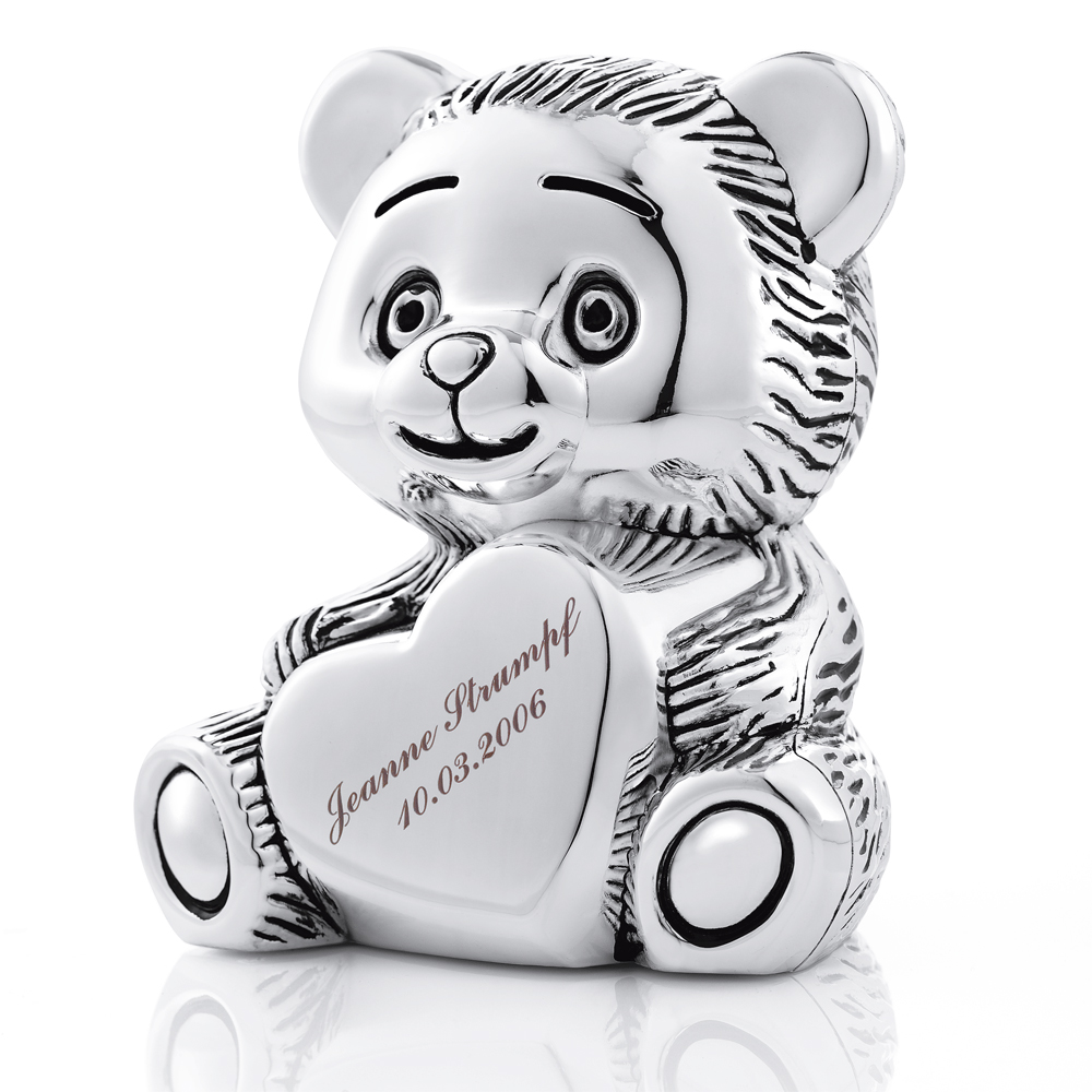 La tirelire personnalisable nounours est une idée cadeau pour le baptême. Le nounours plaqué argent est lui même un cadeau précieux, gravé d'un coeur et de votre dédicace il harmonise avec la douceur de bébé et sera bientôt un souvenir touchant pour toute la famille.