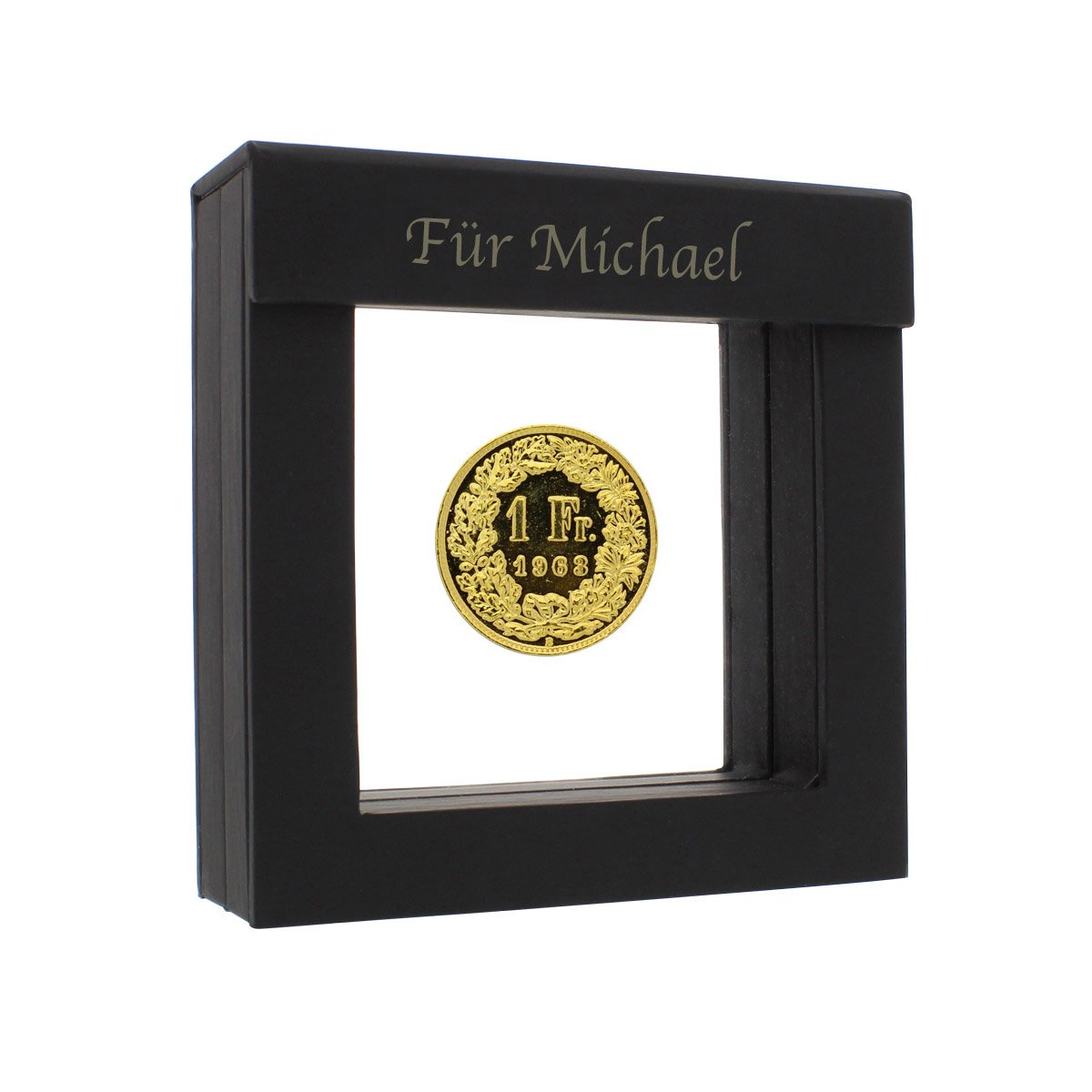 Offrez une pièce nostalgique de 1 franc suisse plaqué or. C'est une pièce de collection unique et authentique de l'année de naissance. Personnalisée et dans son cadre, l'effet est garanti sur un bureau ou dans une vitrine ! Donnez une touche personnelle à votre cadeau ! A l'aide d'une technique laser très moderne, il est possible de faire graver le nom de la personne sur le cadre. Disponible pour les années 1943 à 2012.